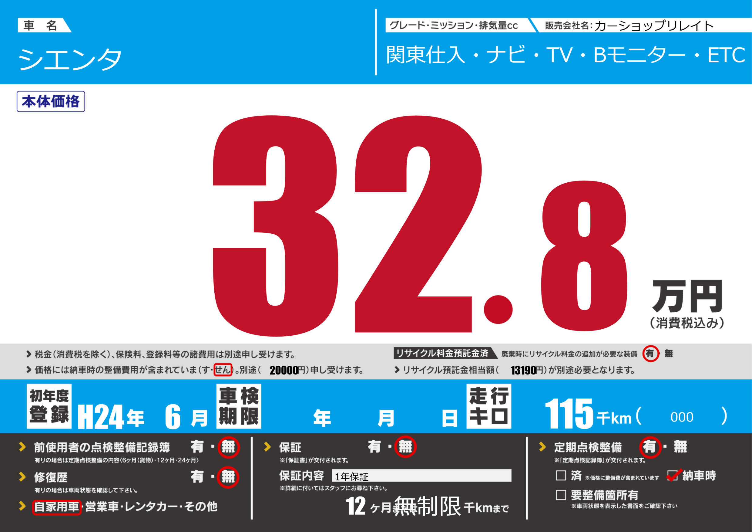 | 車名 | シエンタ | グレード ミッション 排気量 |