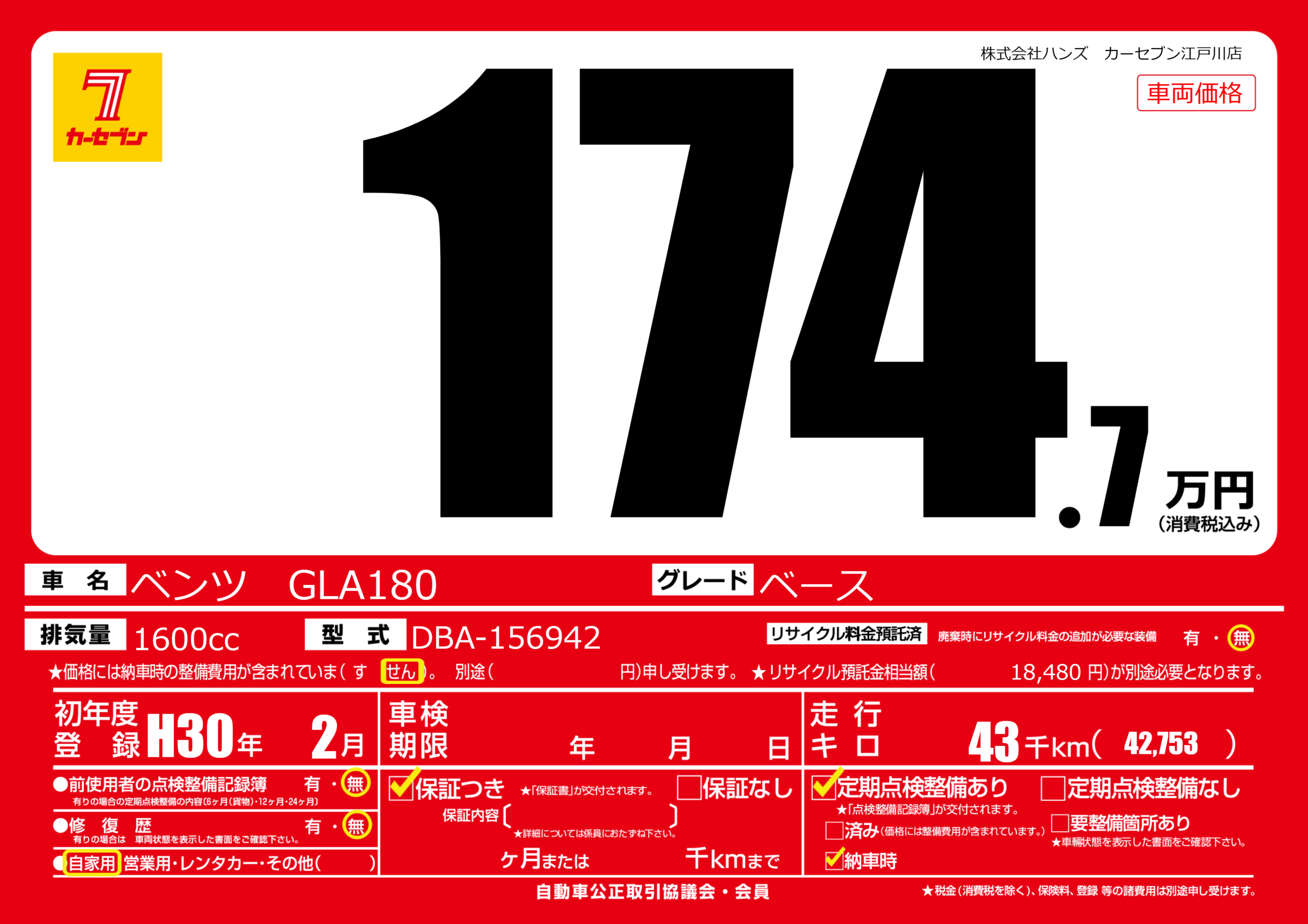 | 車名 | ベンツ GLA180 | グレード ミッション 排気量 |