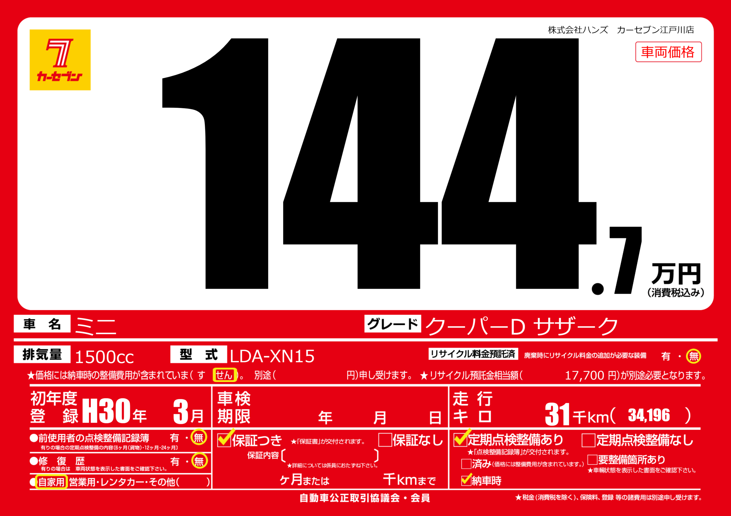 | 車名 | ミニ | グレード ミッション 排気量 |