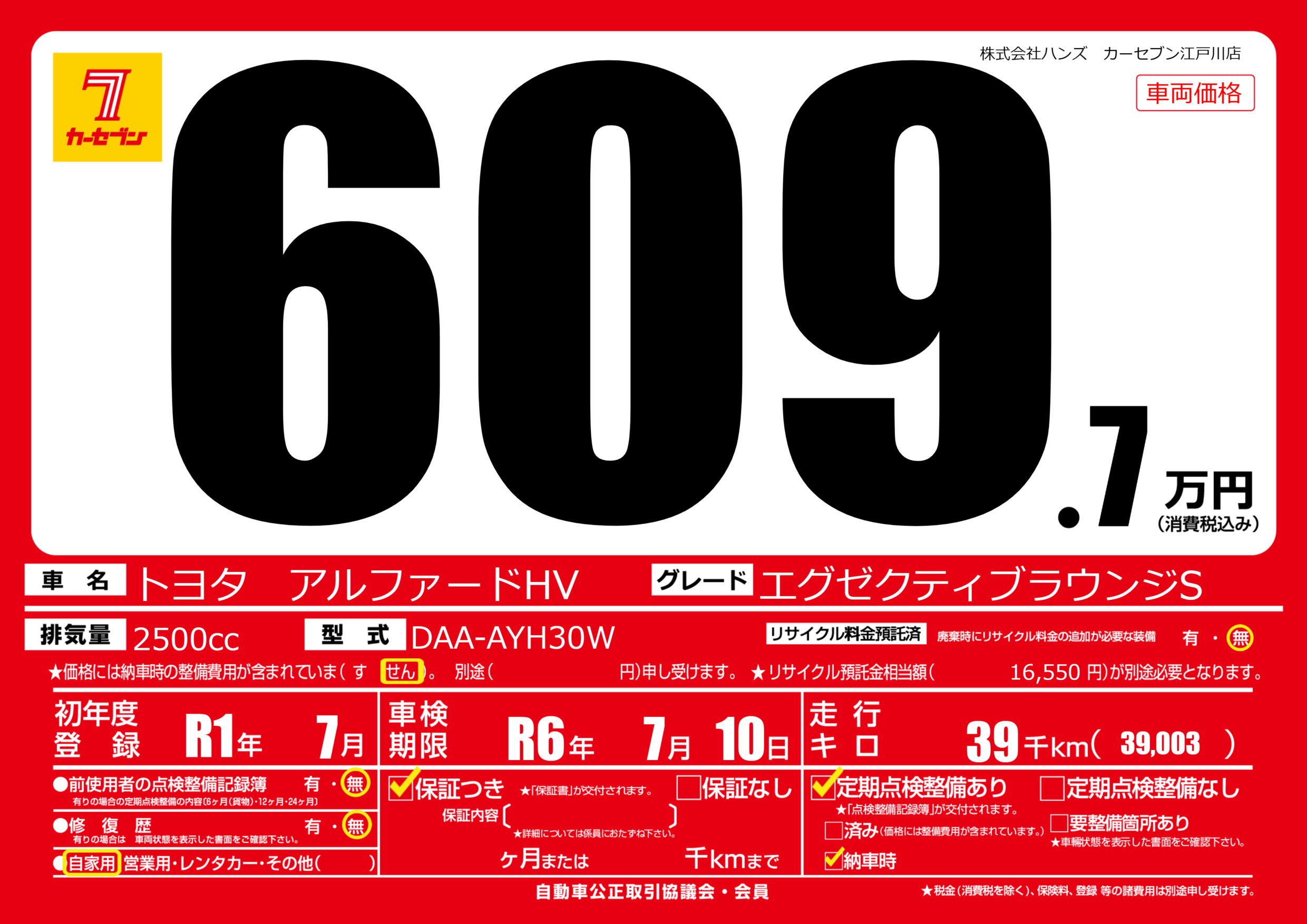 | 車名 | トヨタ アルファードHV | グレード ミッション 排気量 |