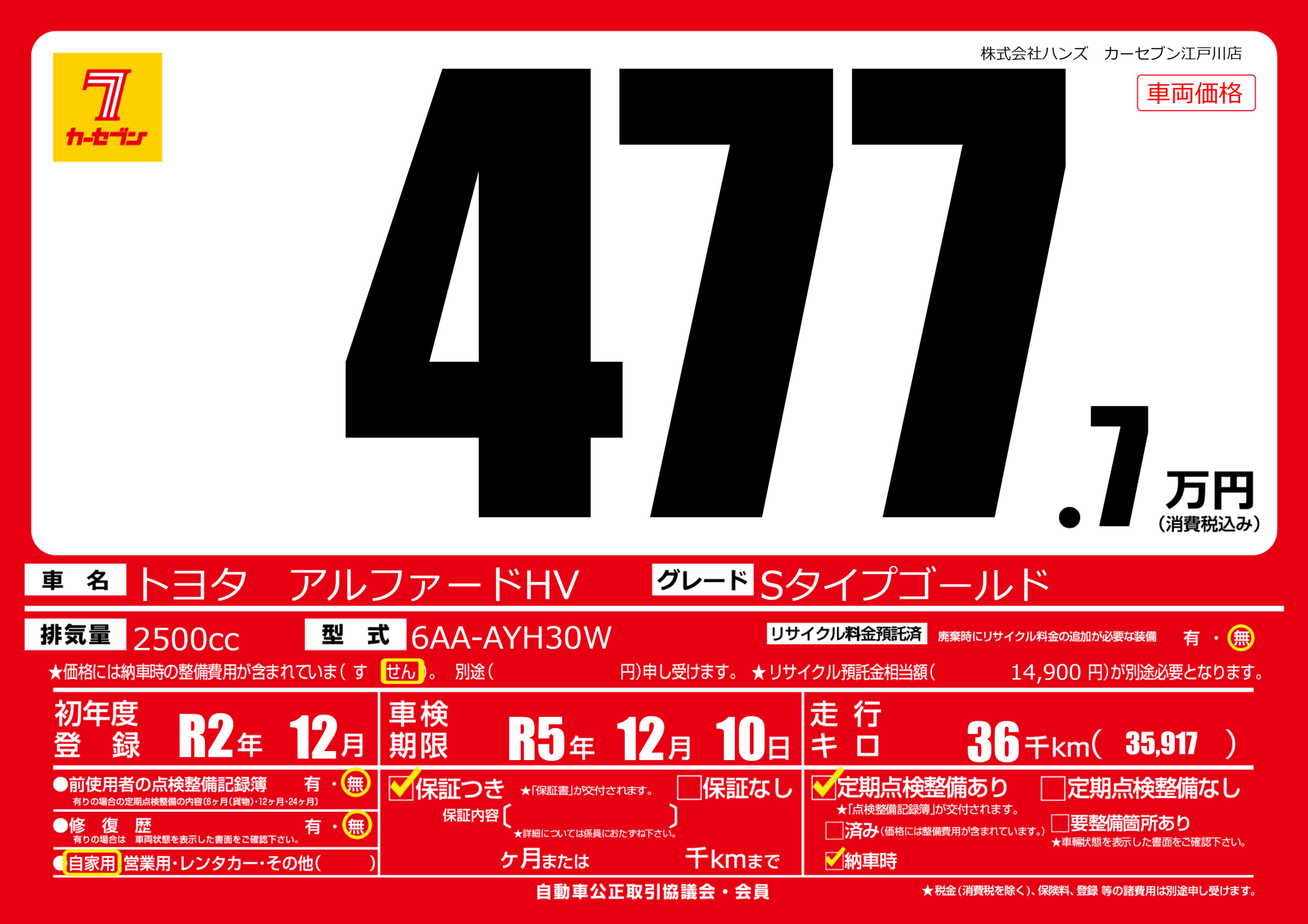 | 車名 | トヨタ アルファードHV | グレード ミッション 排気量 |