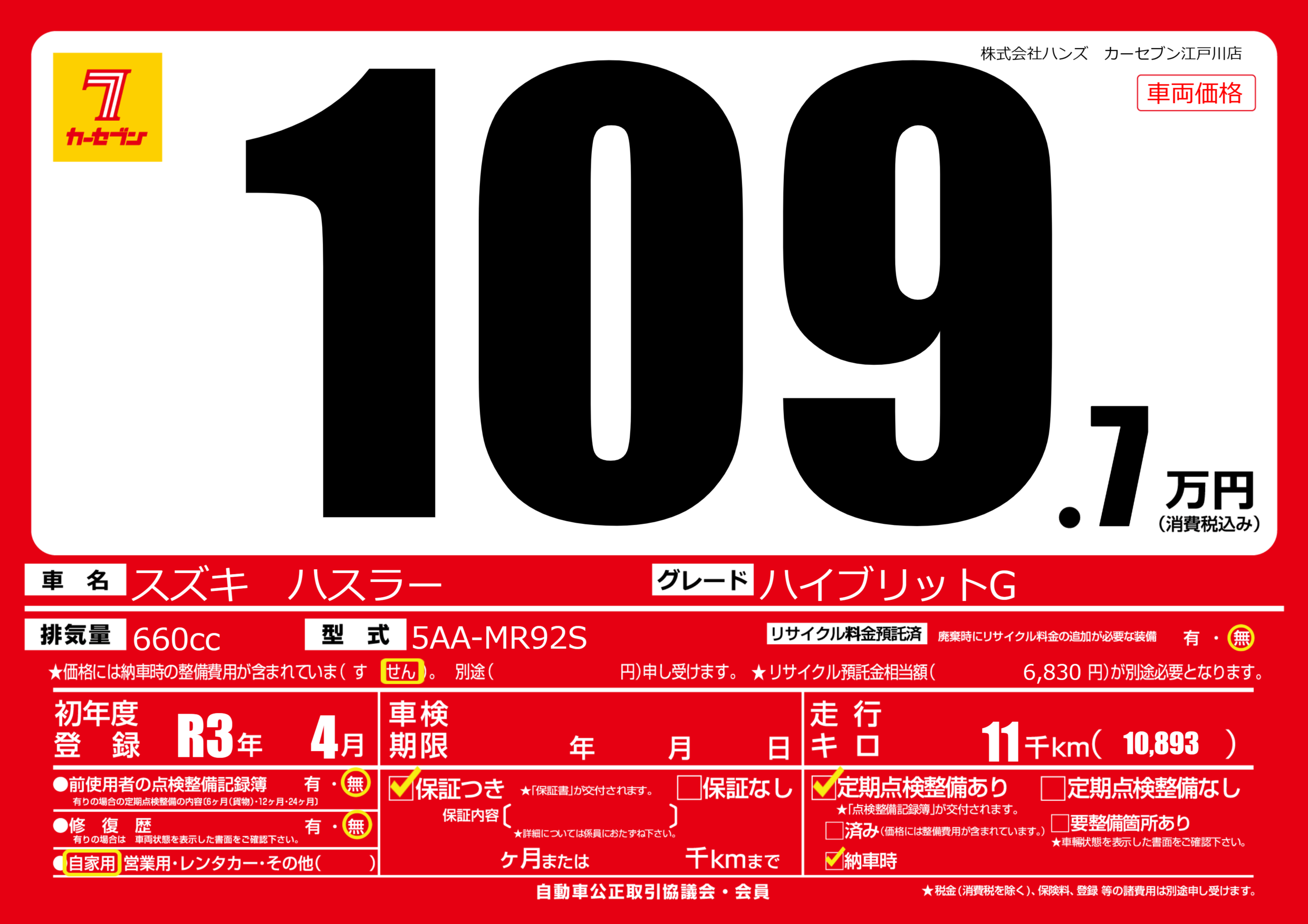 | 走行キロ | 1.1万km | 初年度登録 | R3年4月 |