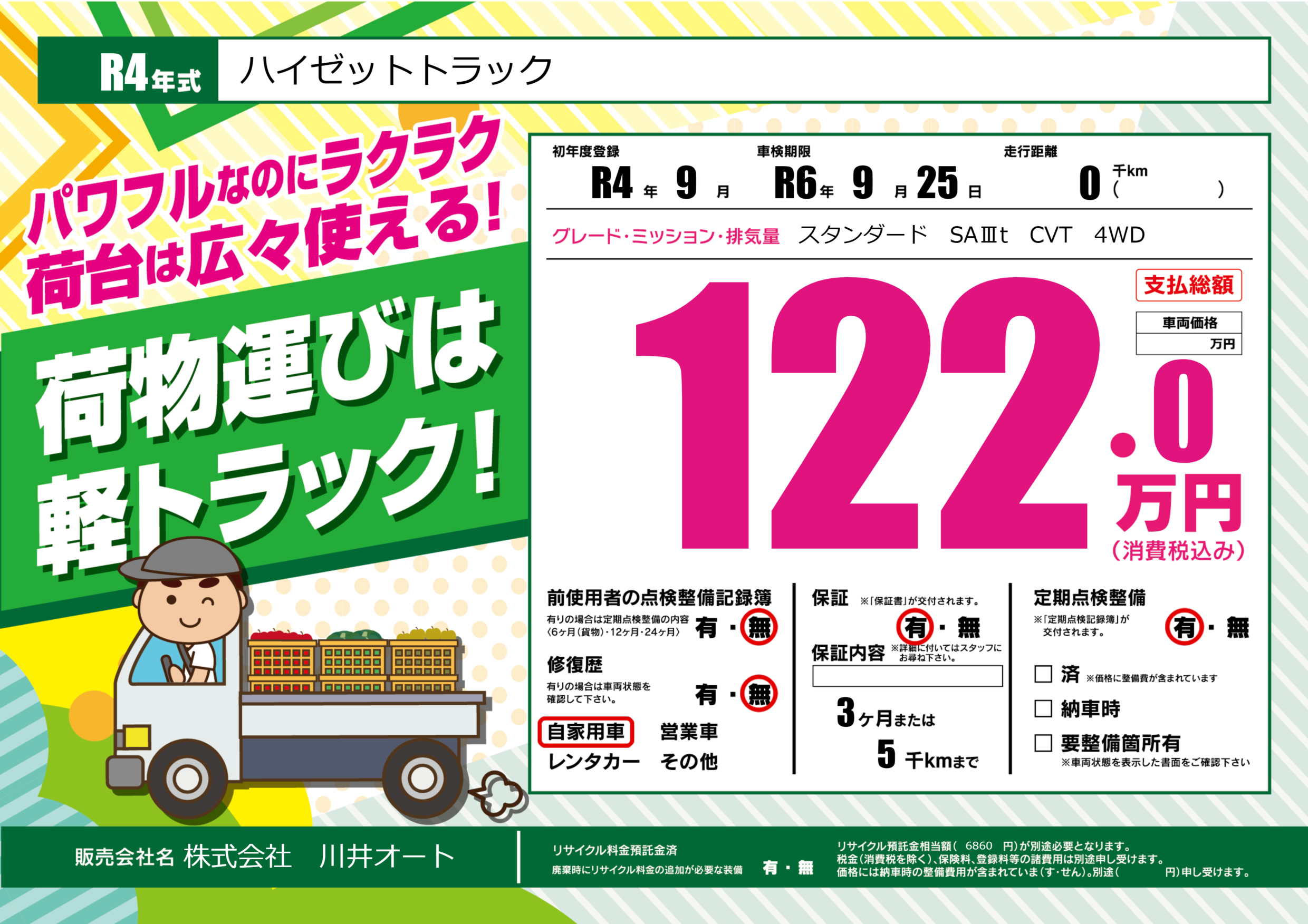 | 車名 | ハイゼットトラック | グレード ミッション 排気量 |