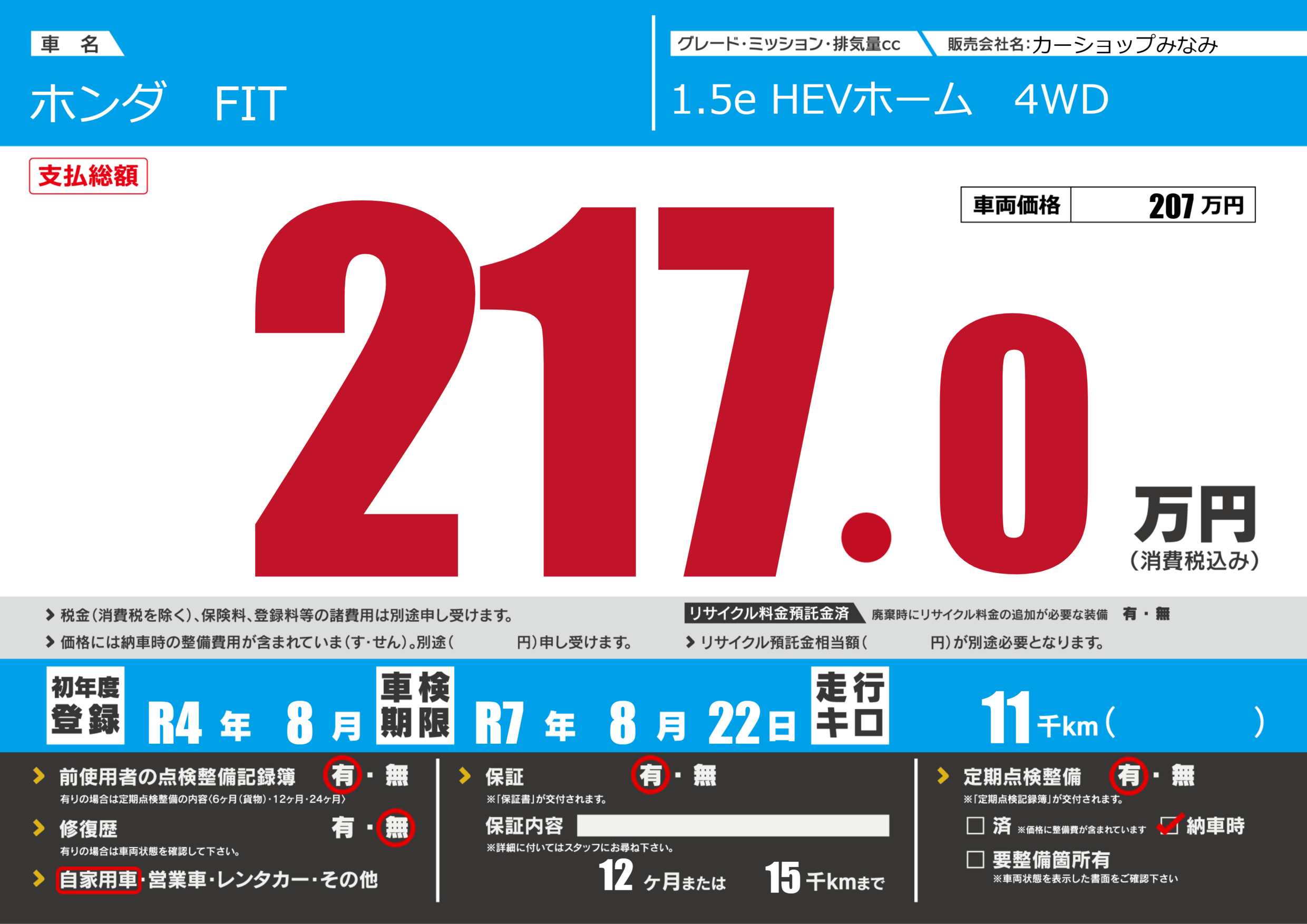 保証付き 保証内容(---) 12ヶ月または(15)千kmまで |