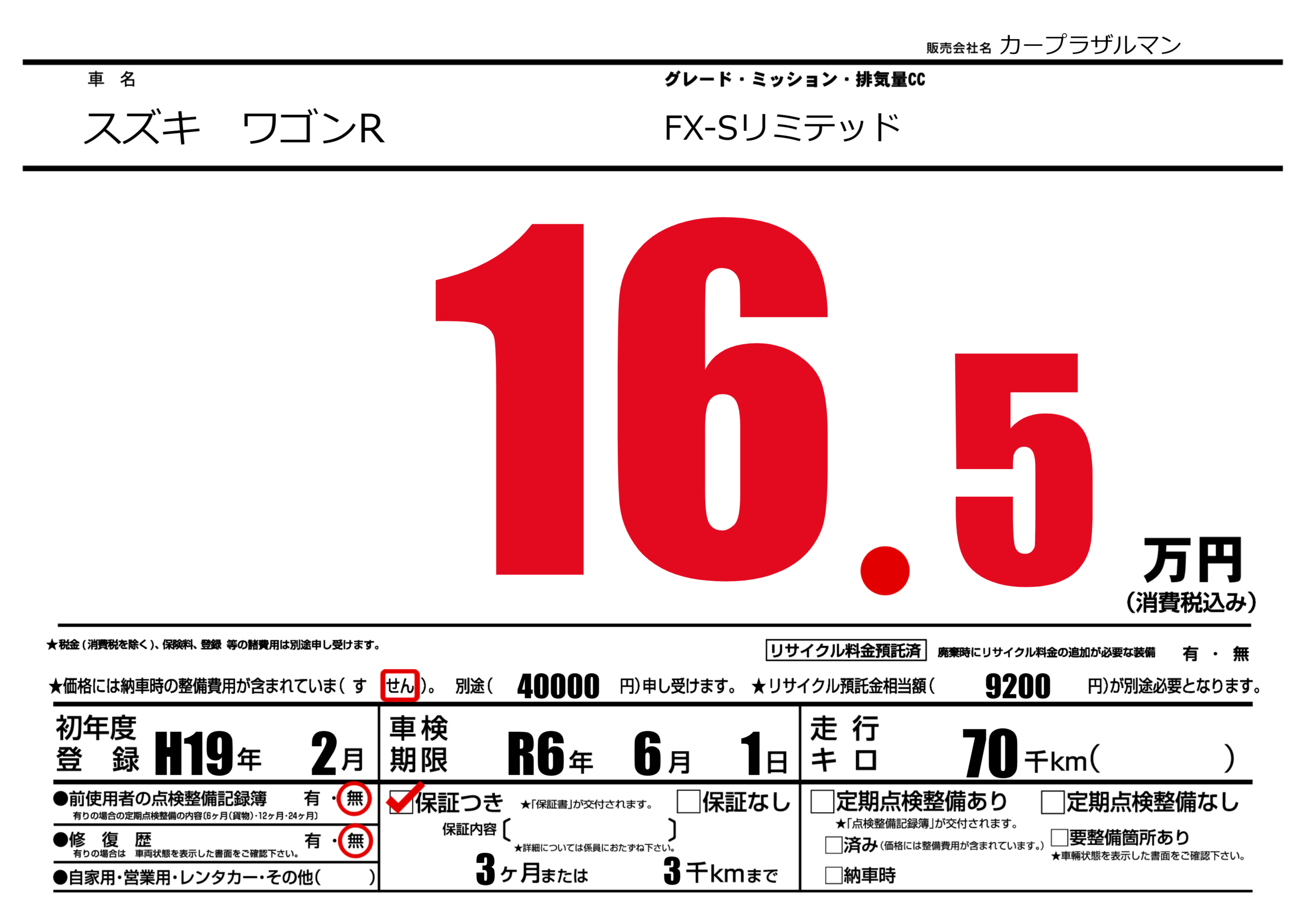 保証付き 保証内容(---) 3ヶ月または(3)千kmまで |