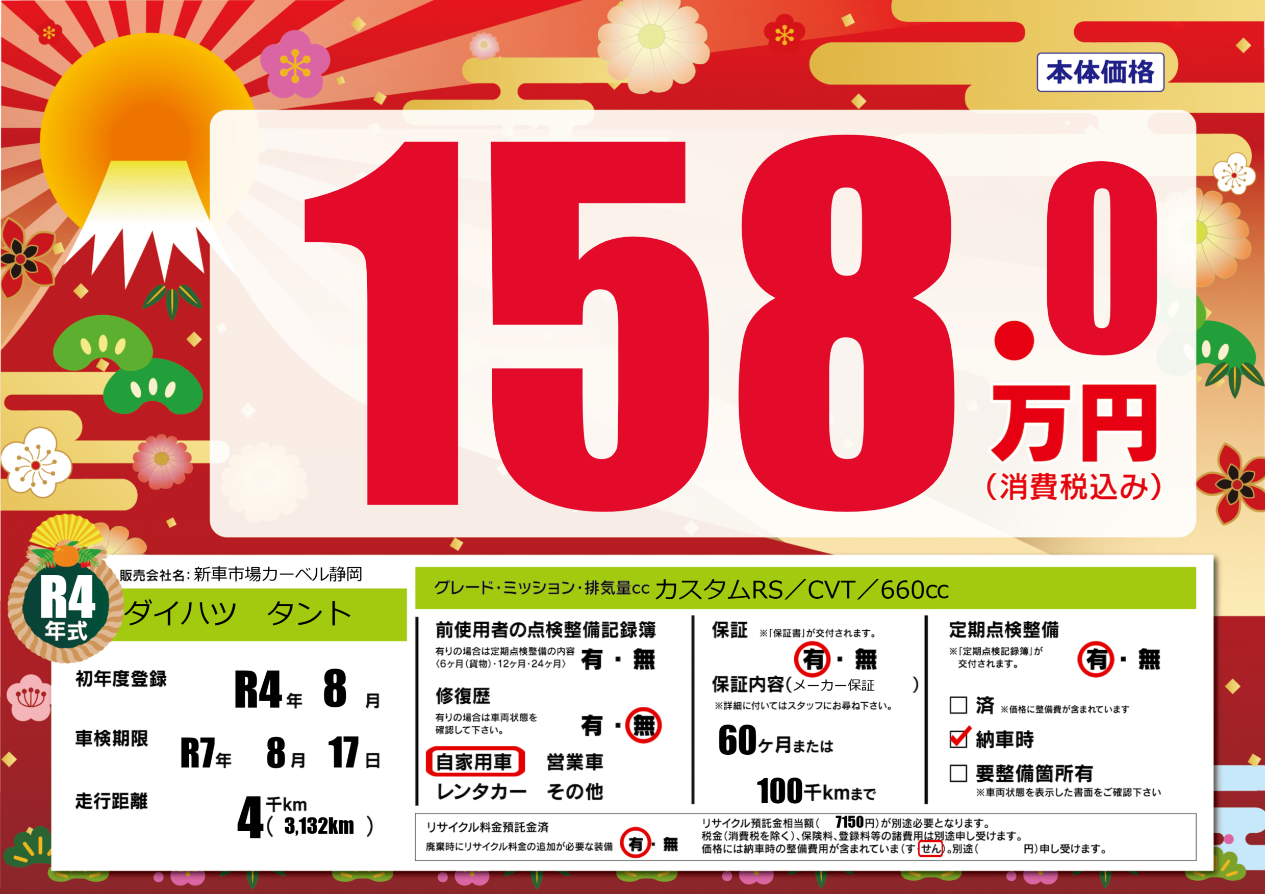 | 走行キロ | 0.4万km | 初年度登録 | R4年8月 |