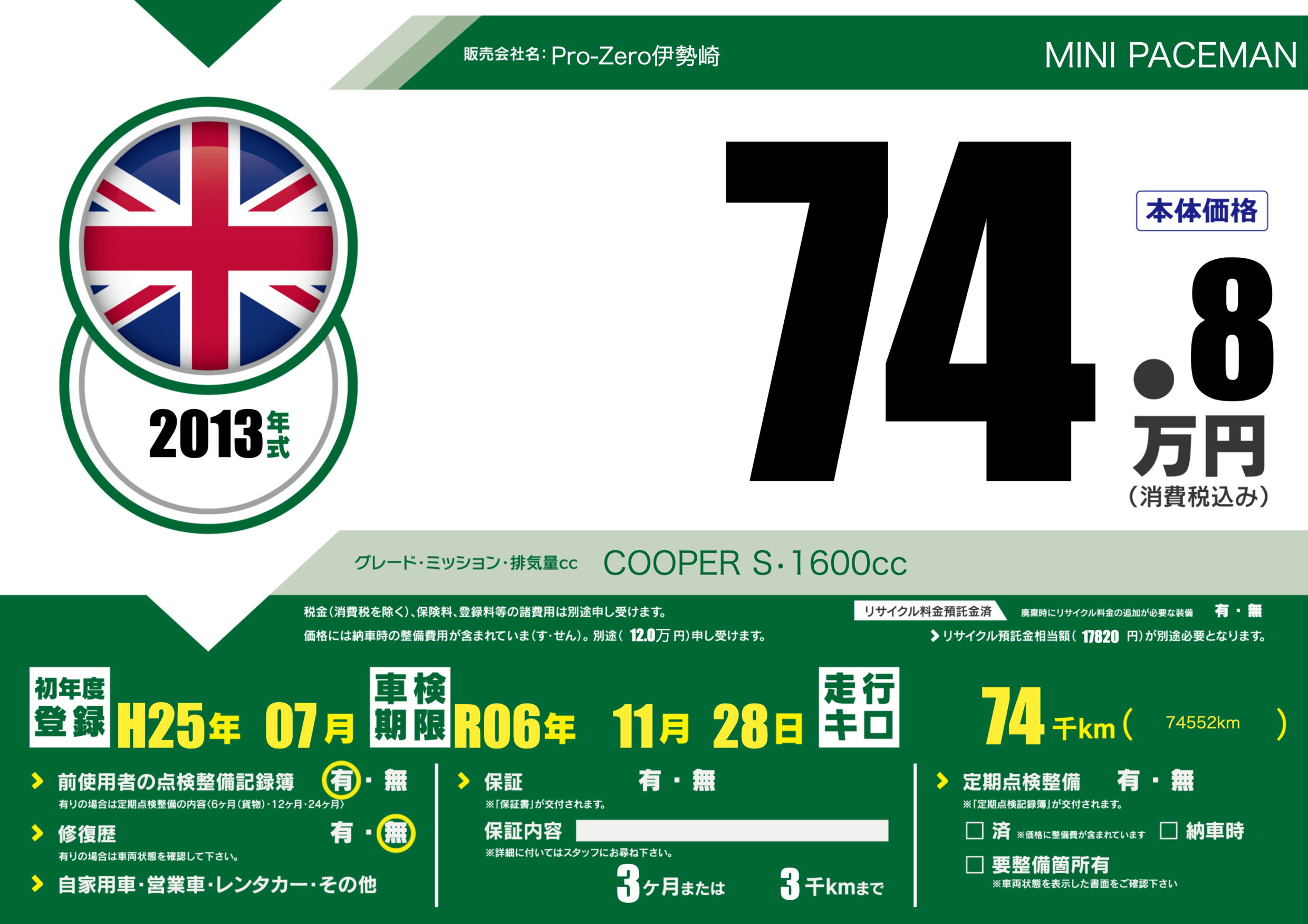 | 車名 | MINI PACEMAN | グレード ミッション 排気量 |