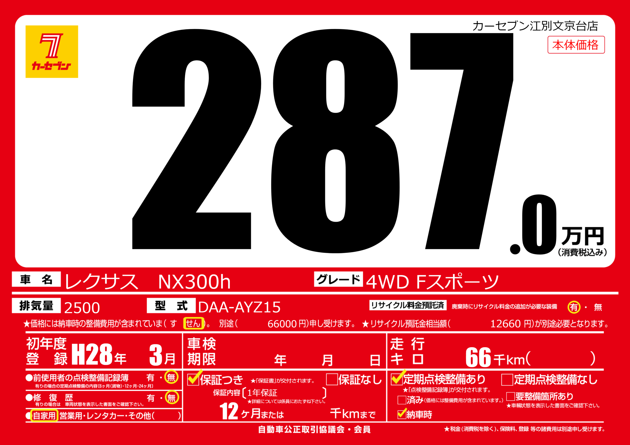 | 車名 | レクサス NX300h | グレード ミッション 排気量 |