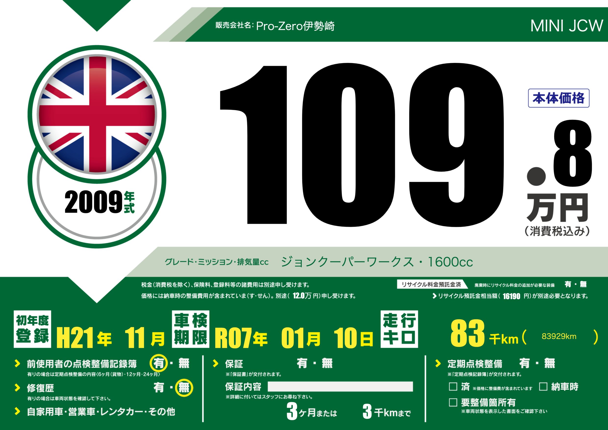 | 車名 | MINI JCW | グレード ミッション 排気量 |