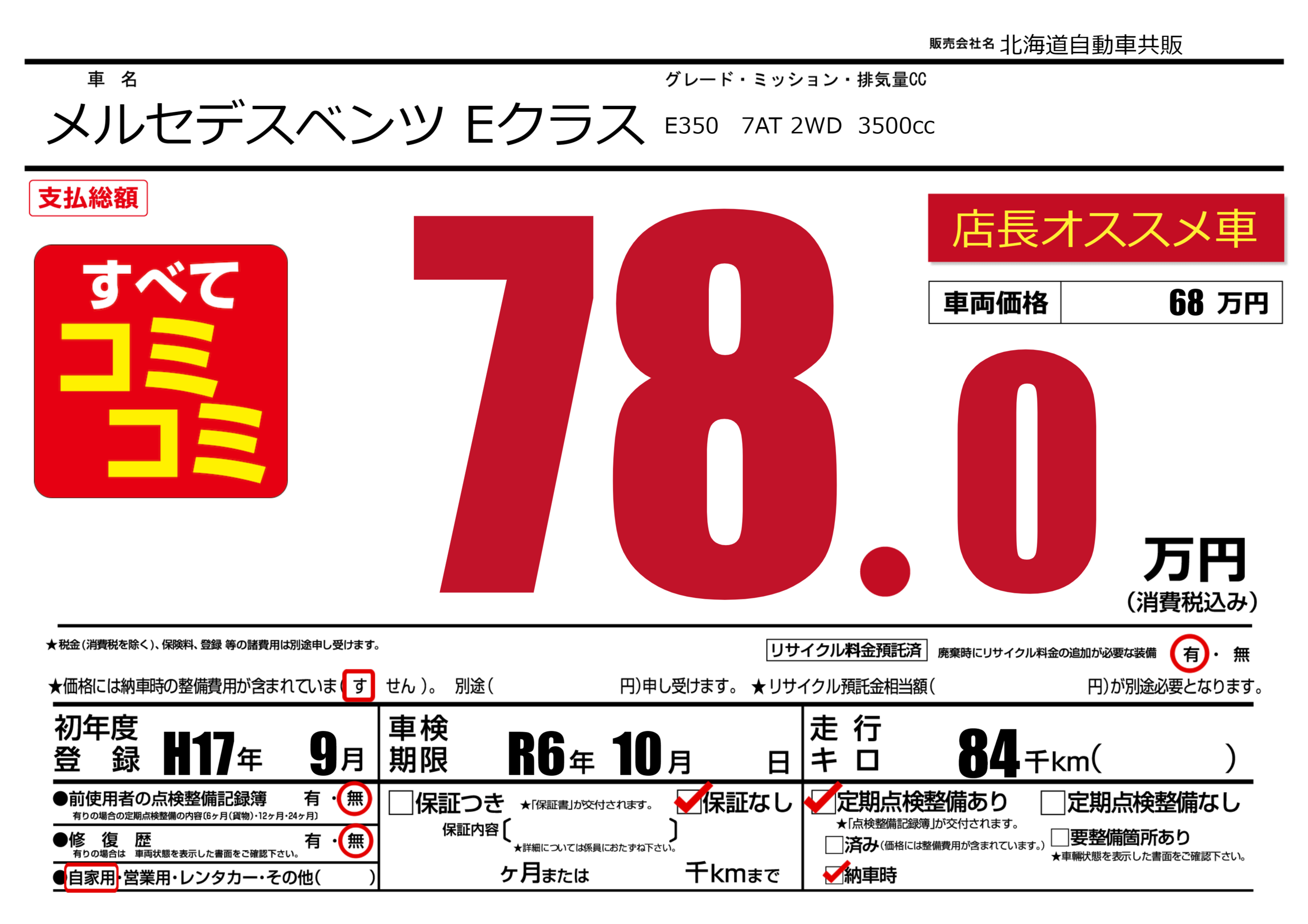 | 車名 | メルセデスベンツ Eクラス | グレード ミッション 排気量 |
