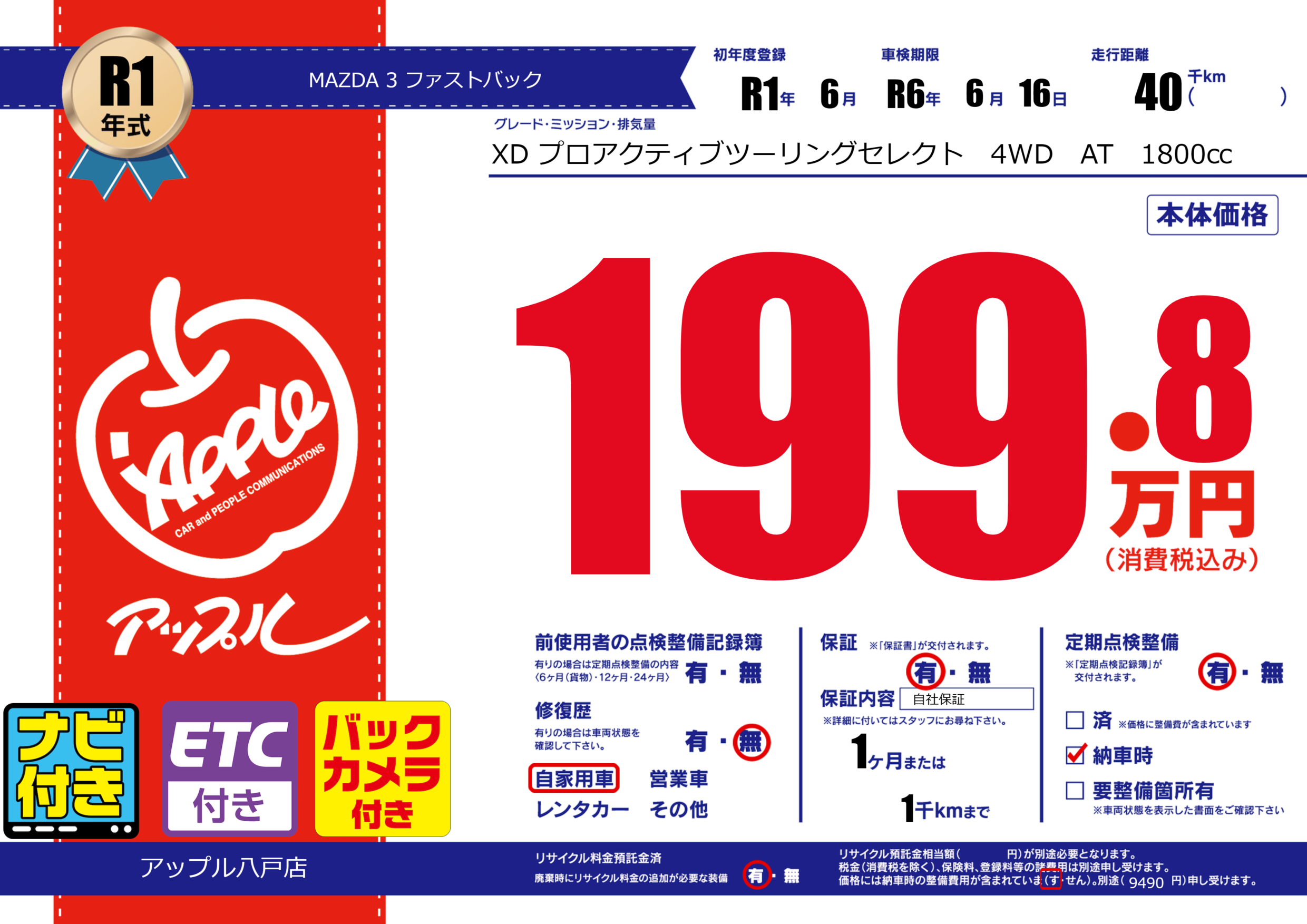 保証付き 保証内容( 自社保証) 1ヶ月または(1)千kmまで |