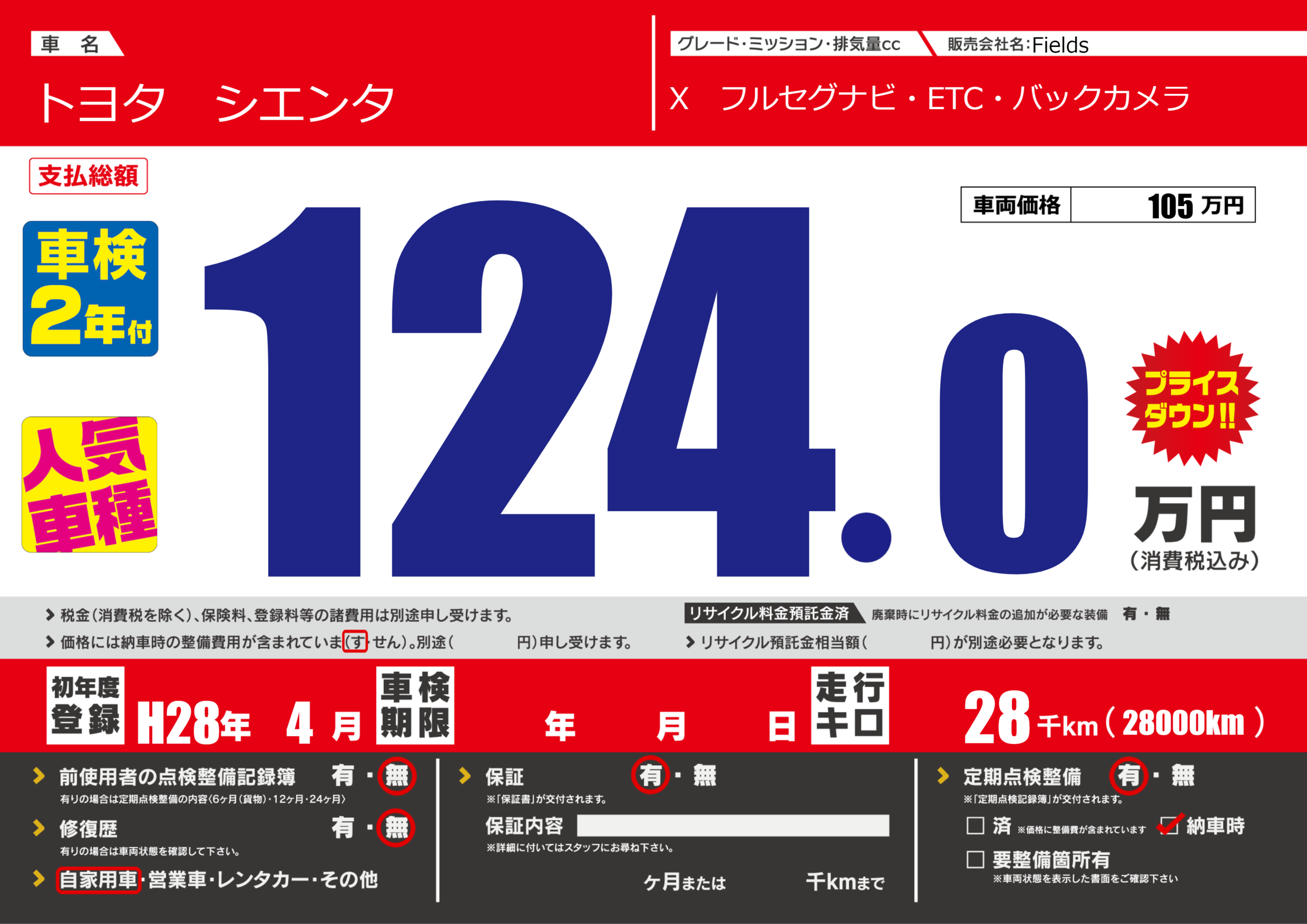 | 定期点検整備 | 定期点検整備あり 納車時あり | ||