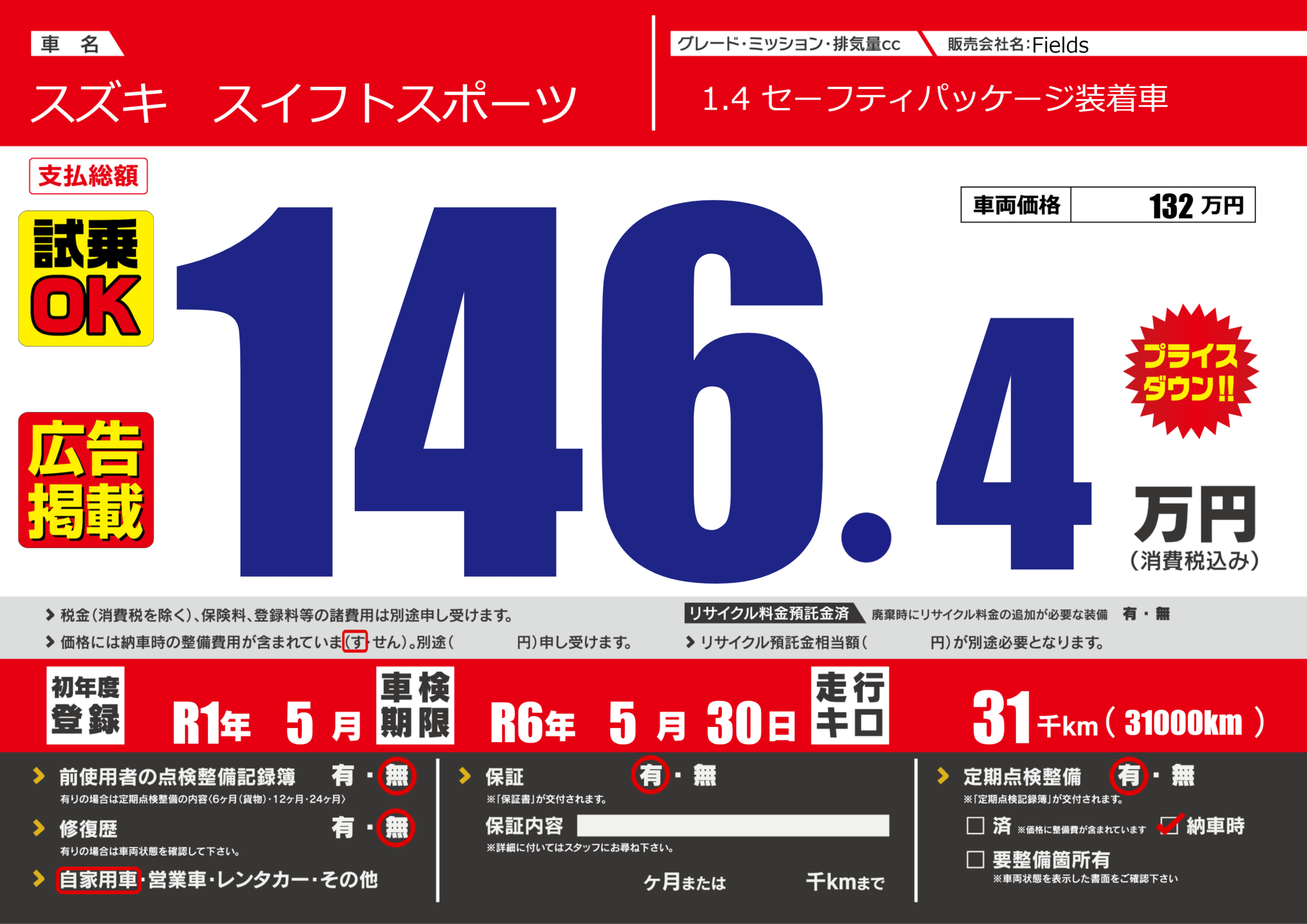 | 車検制限 | R6年 5月 30日 | ||