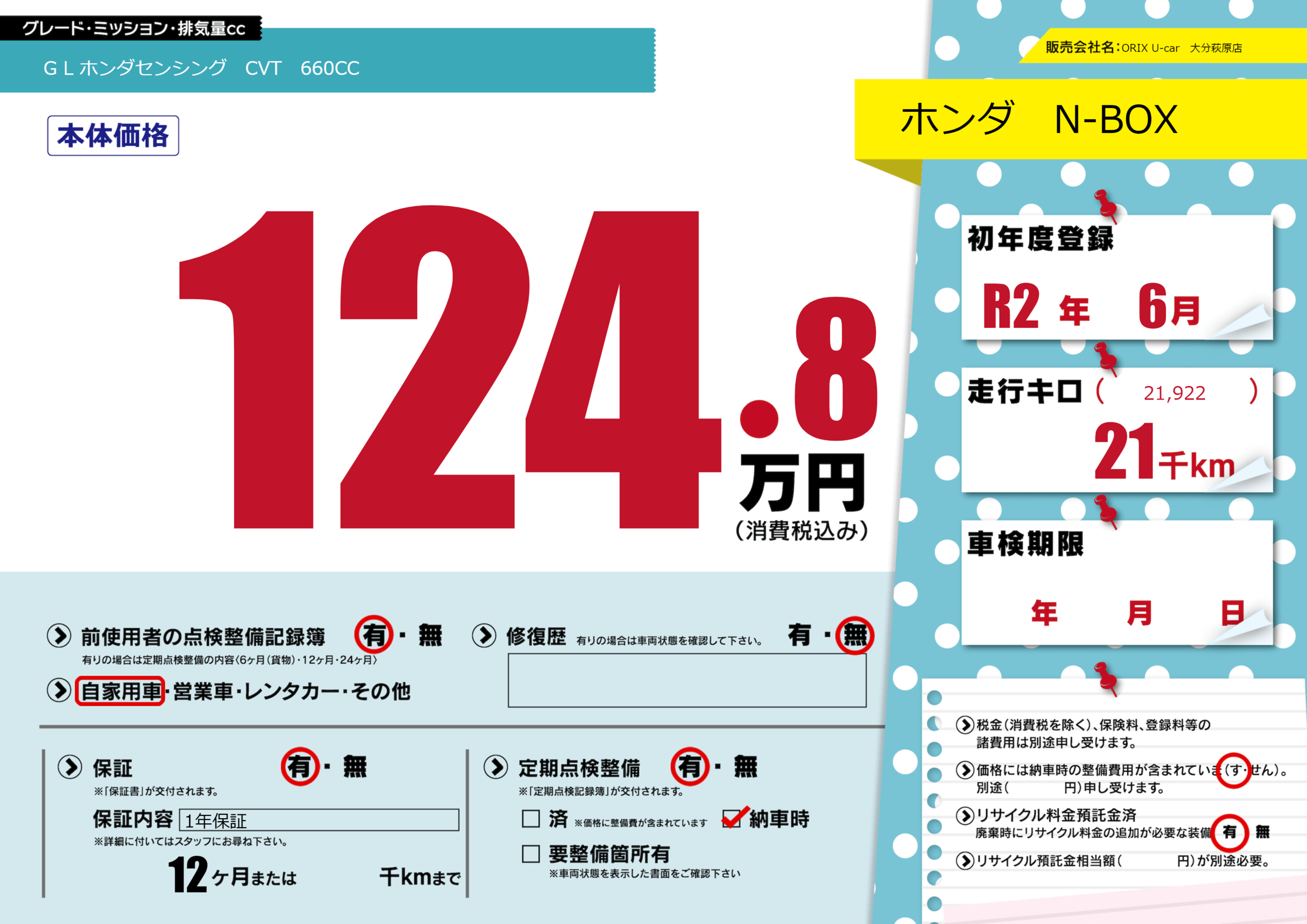 保証付き 保証内容(1年保証) 12ヶ月または()千kmまで |