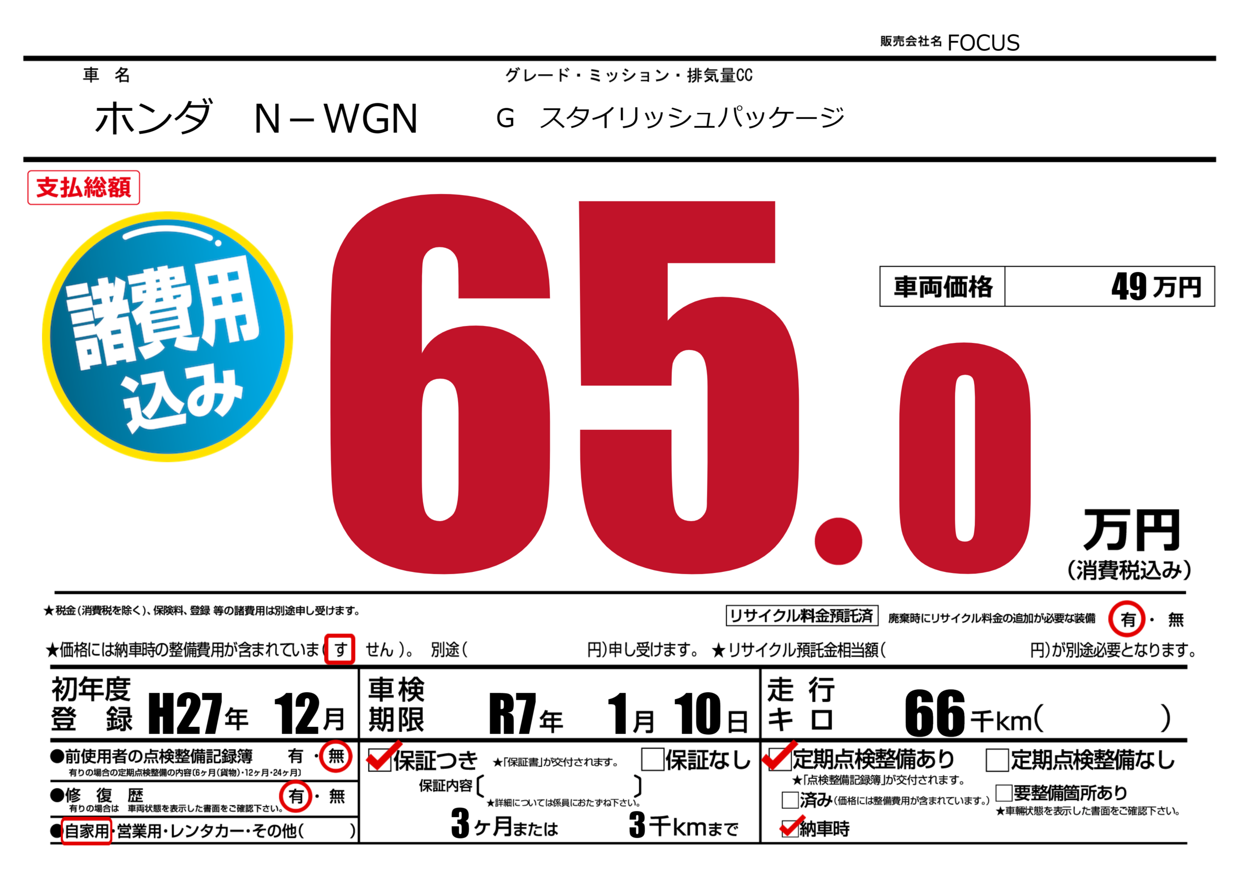 | 車名 | ホンダ N-WGN | グレード ミッション 排気量 |