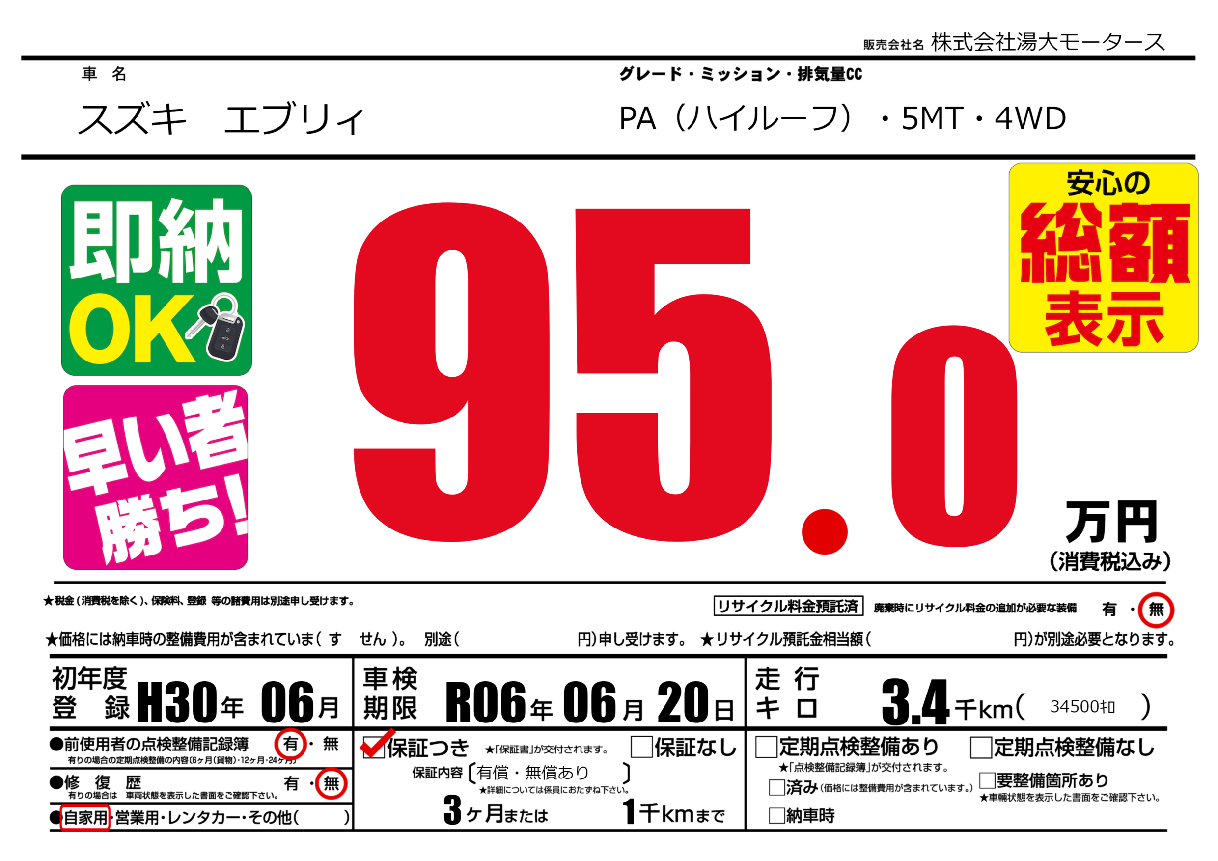 | 車名 | スズキ エブリィ | グレード ミッション 排気量 |
