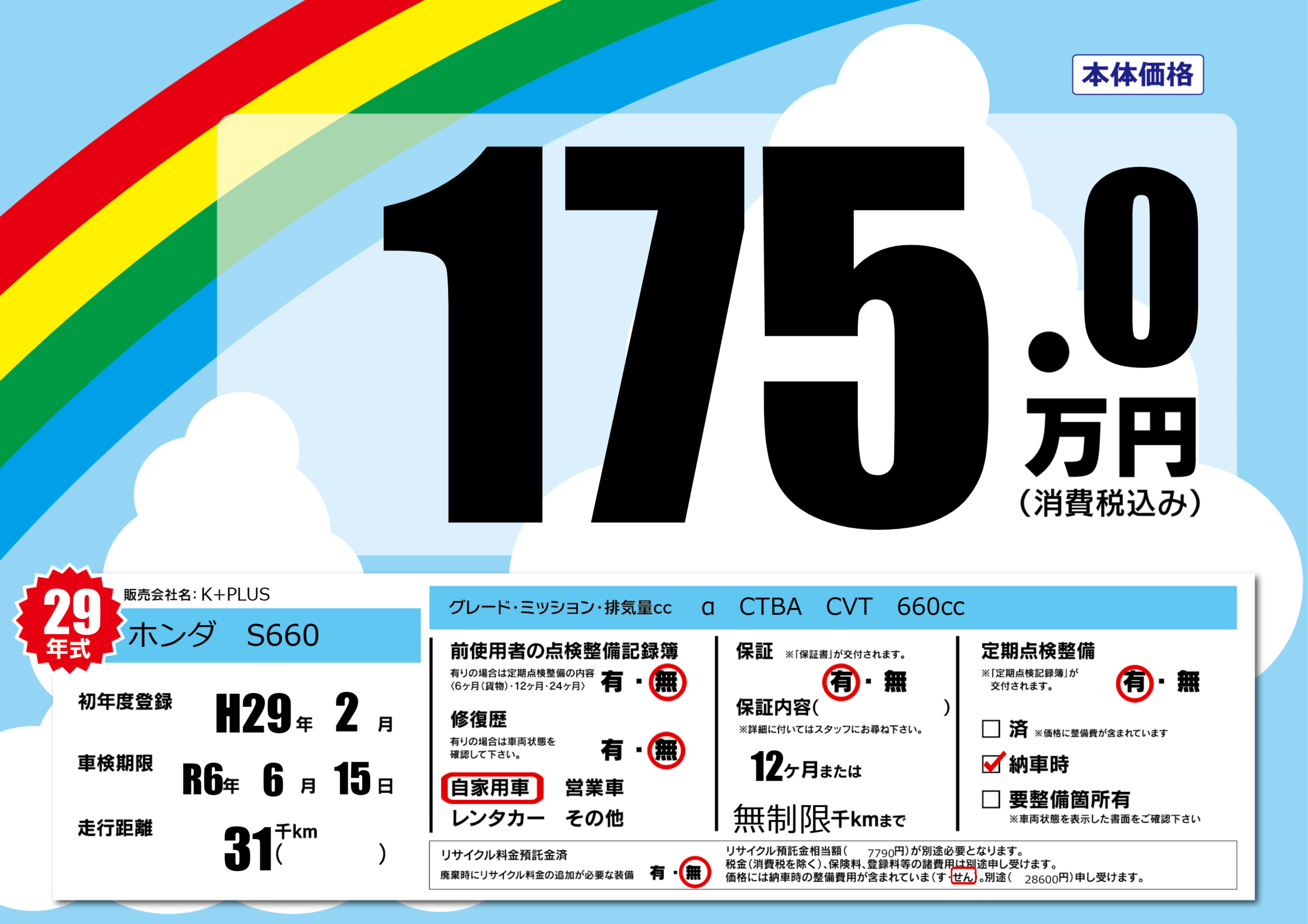 | 定期点検整備 | 定期点検整備あり 納車時あり | ||