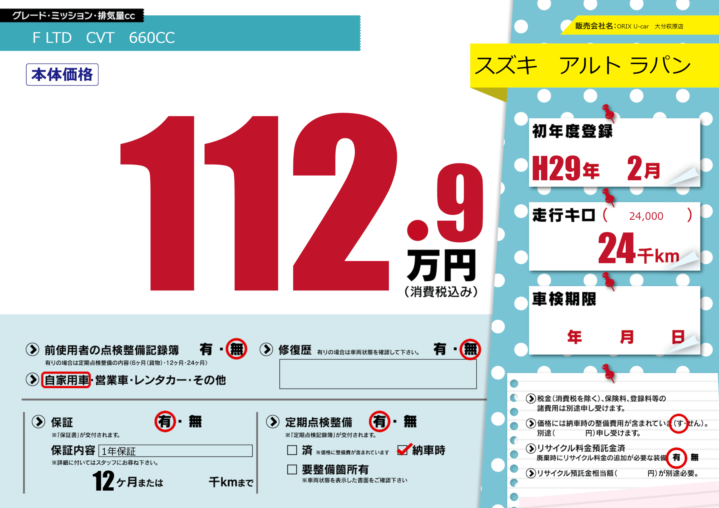 | 定期点検整備 | 定期点検整備あり 納車時あり | ||
