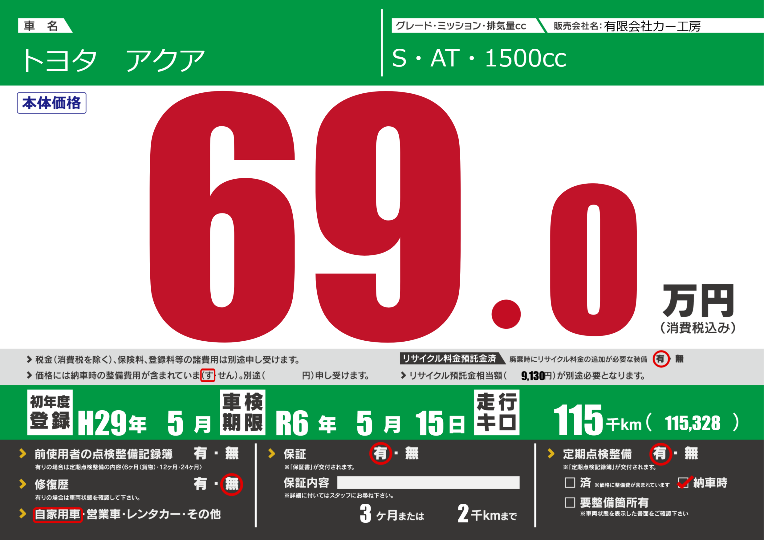 | 車名 | トヨタ アクア | グレード ミッション 排気量 |