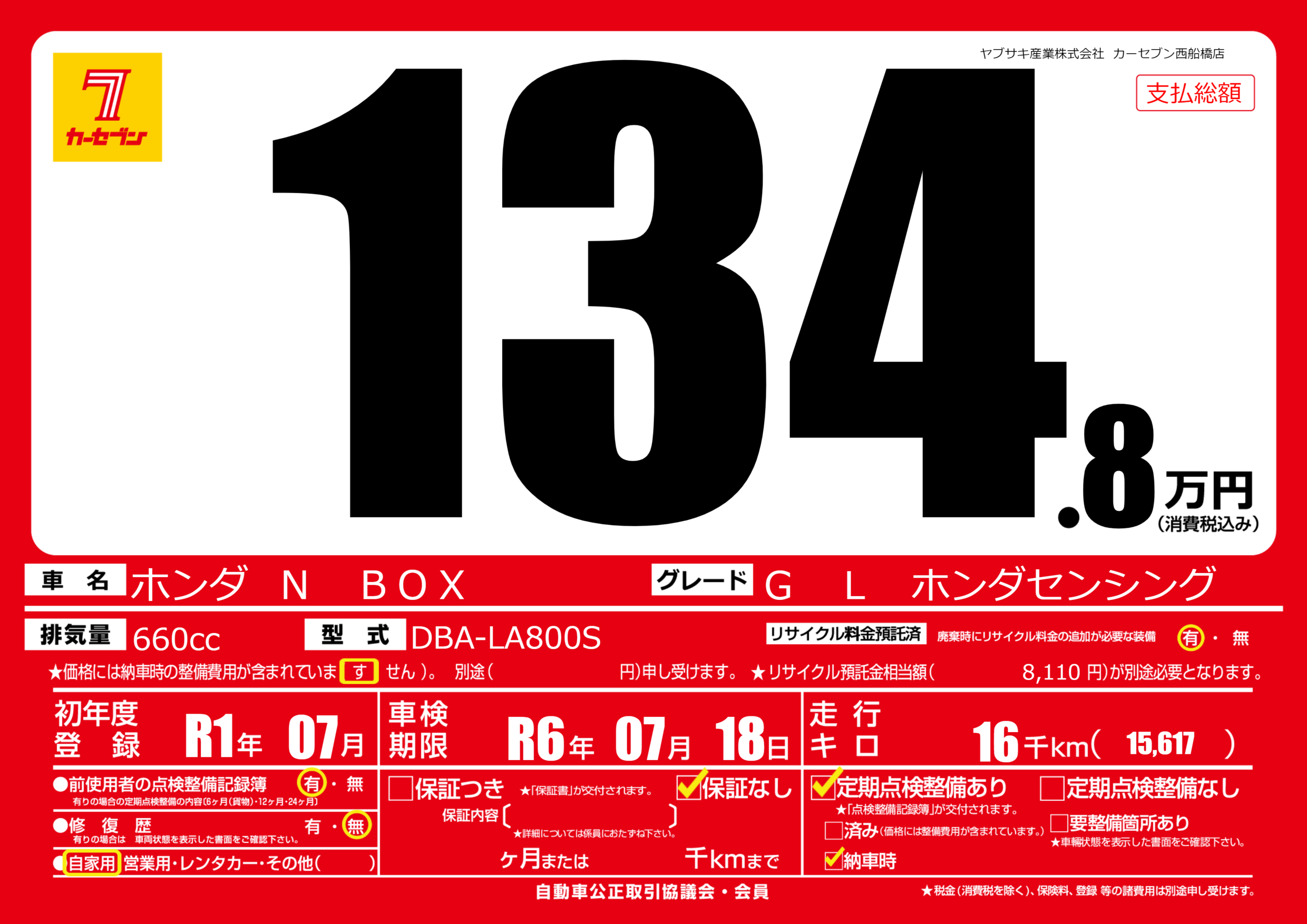 | 車名 | ホンダ N BOX | グレード ミッション 排気量 |
