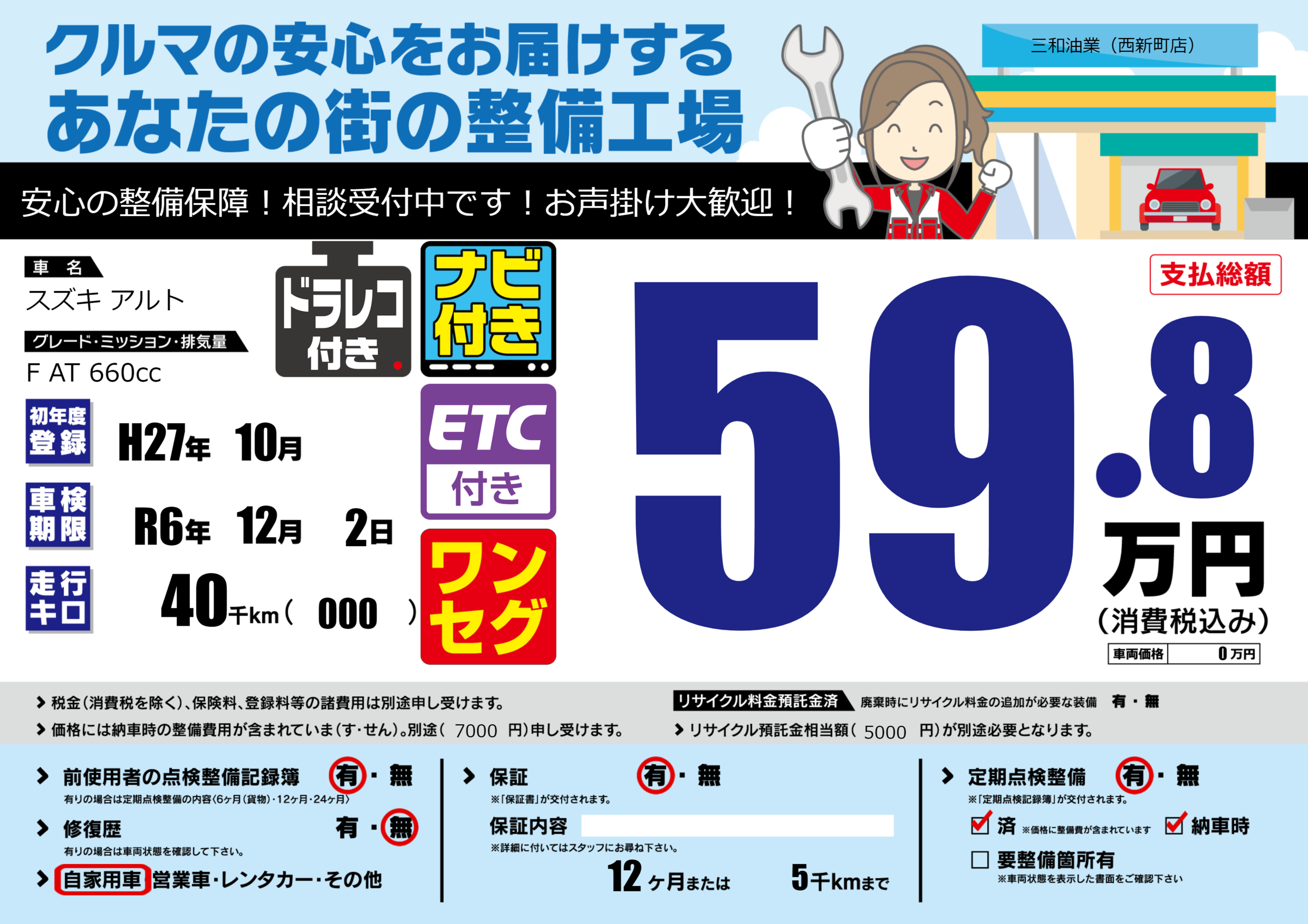 | 定期点検整備 | 定期点検整備あり 定期点検整備済み 納車時あり | ||