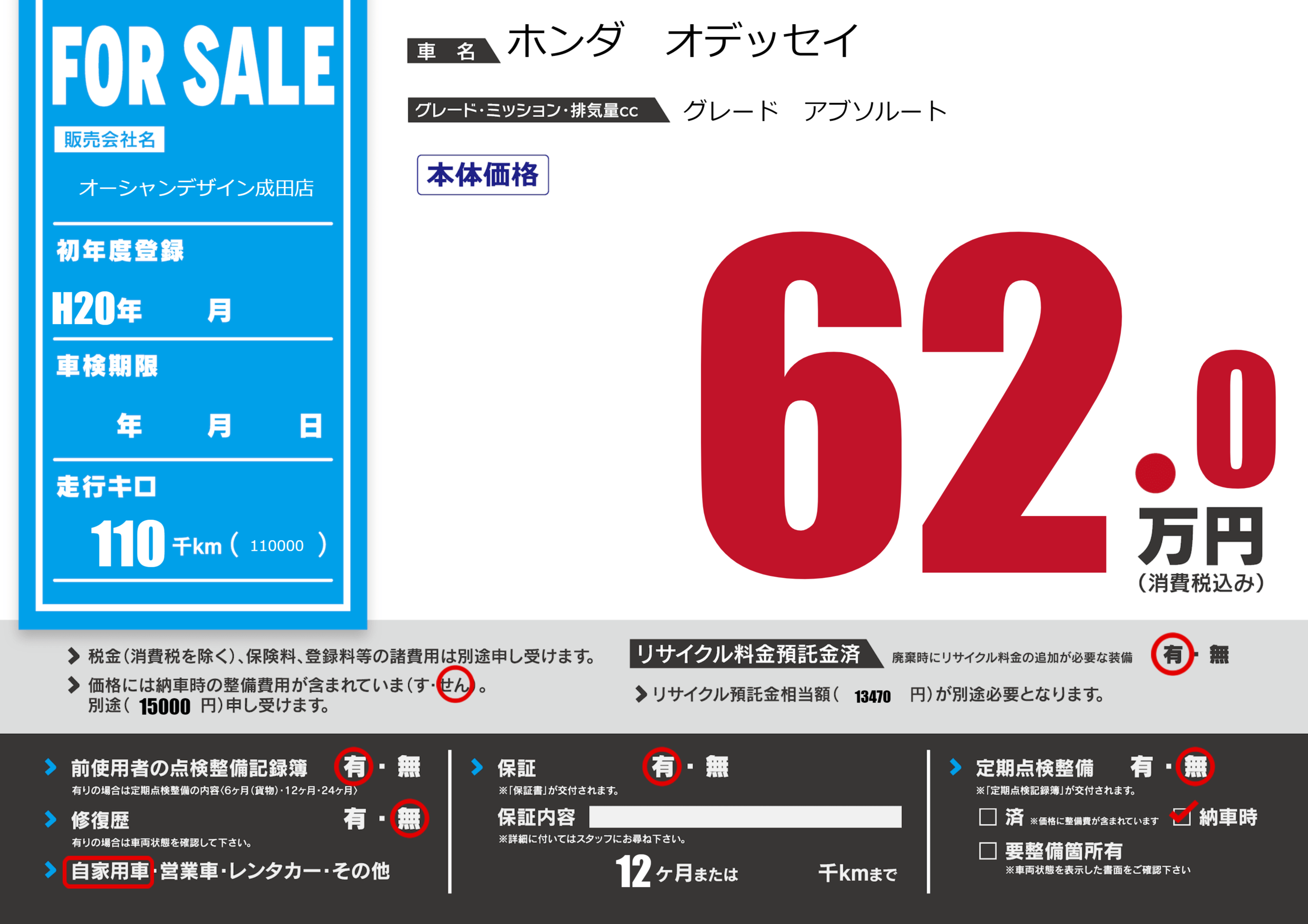 | 車名 | ホンダ オデッセイ | グレード ミッション 排気量 |