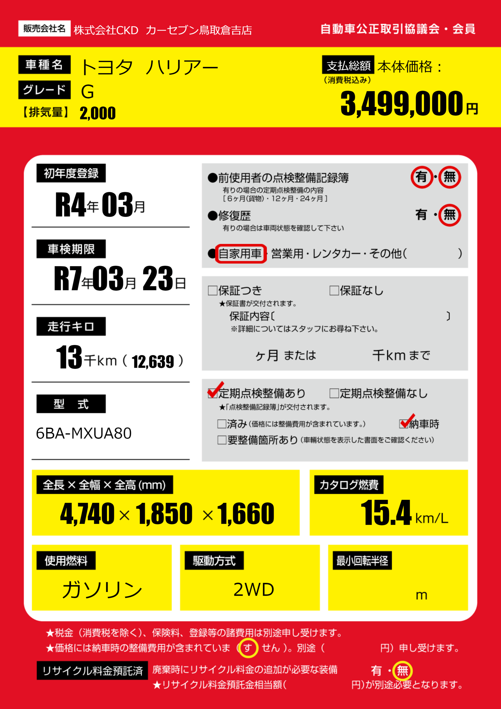 | 車名 | トヨタ ハリアー | グレード ミッション 排気量 |