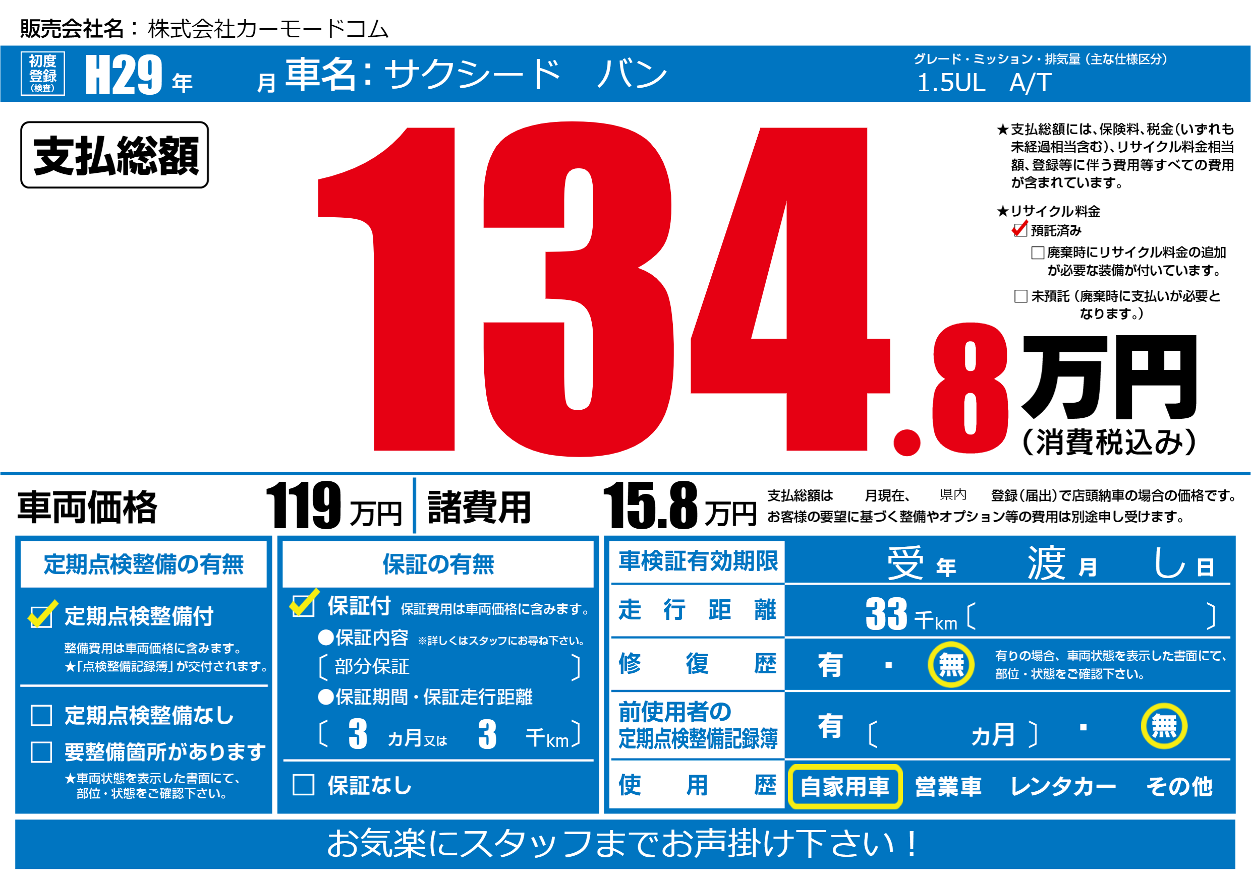 保証付き 保証内容(部分保証) 3ヶ月または(3)千kmまで |