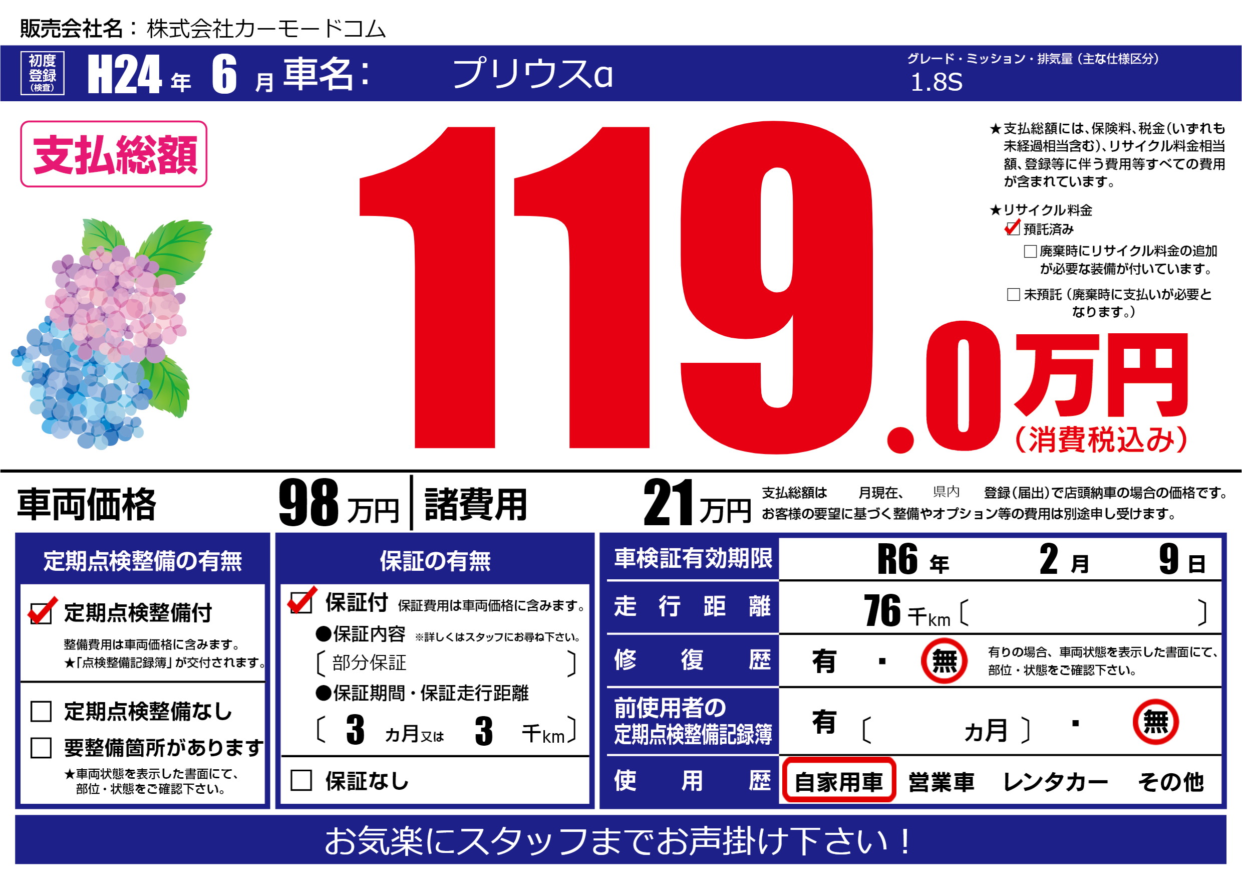 | 走行キロ | 7.6万km | 初年度登録 | H24年6月 |