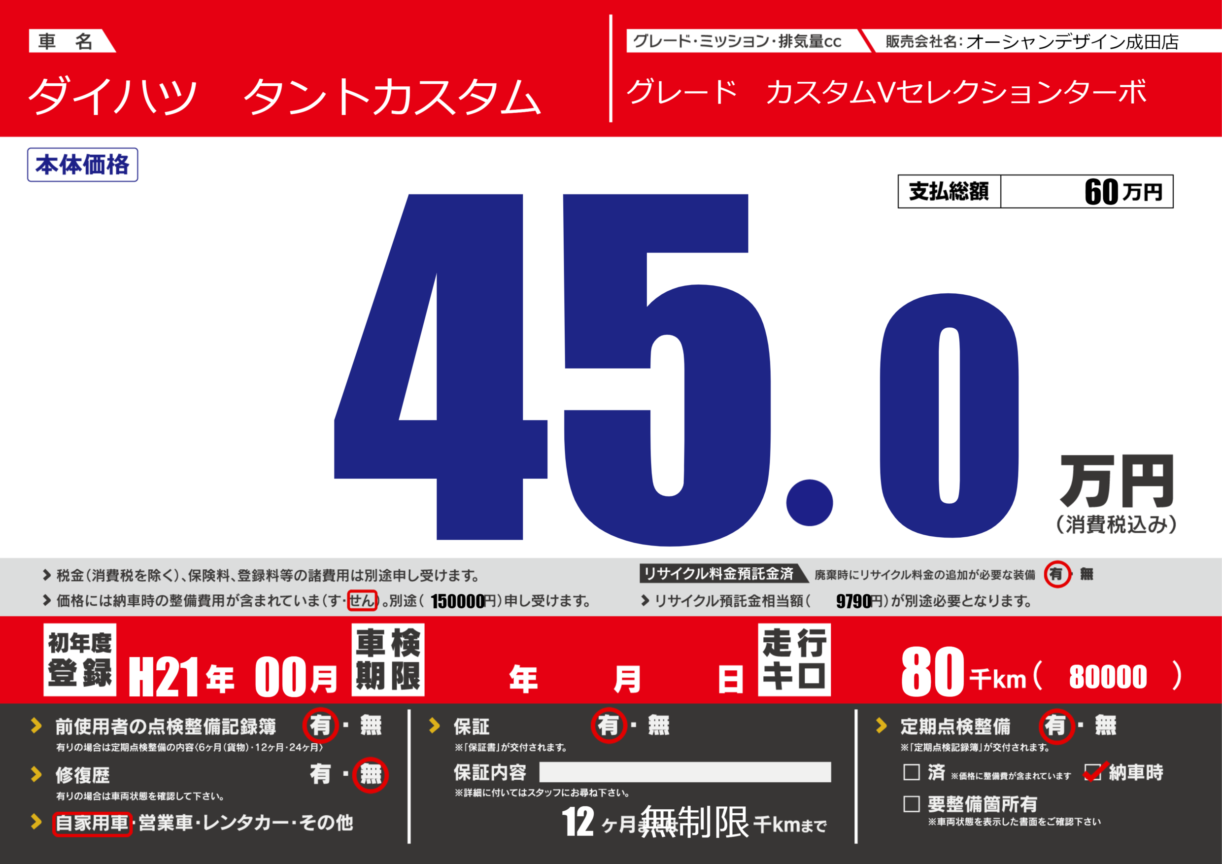 | 走行キロ | 8万km | 初年度登録 | H21年00月 |