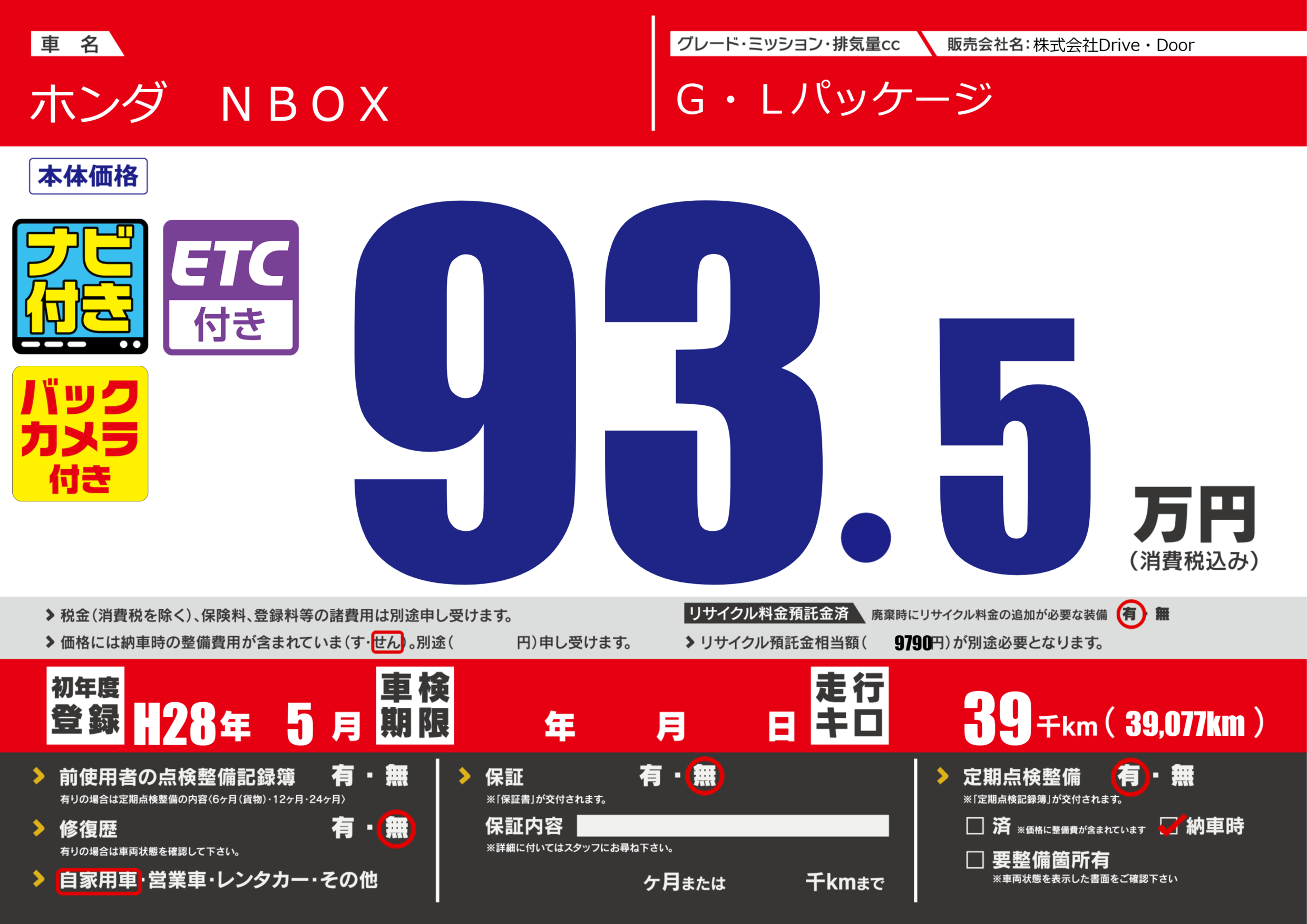 | 定期点検整備 | 定期点検整備あり 納車時あり | ||