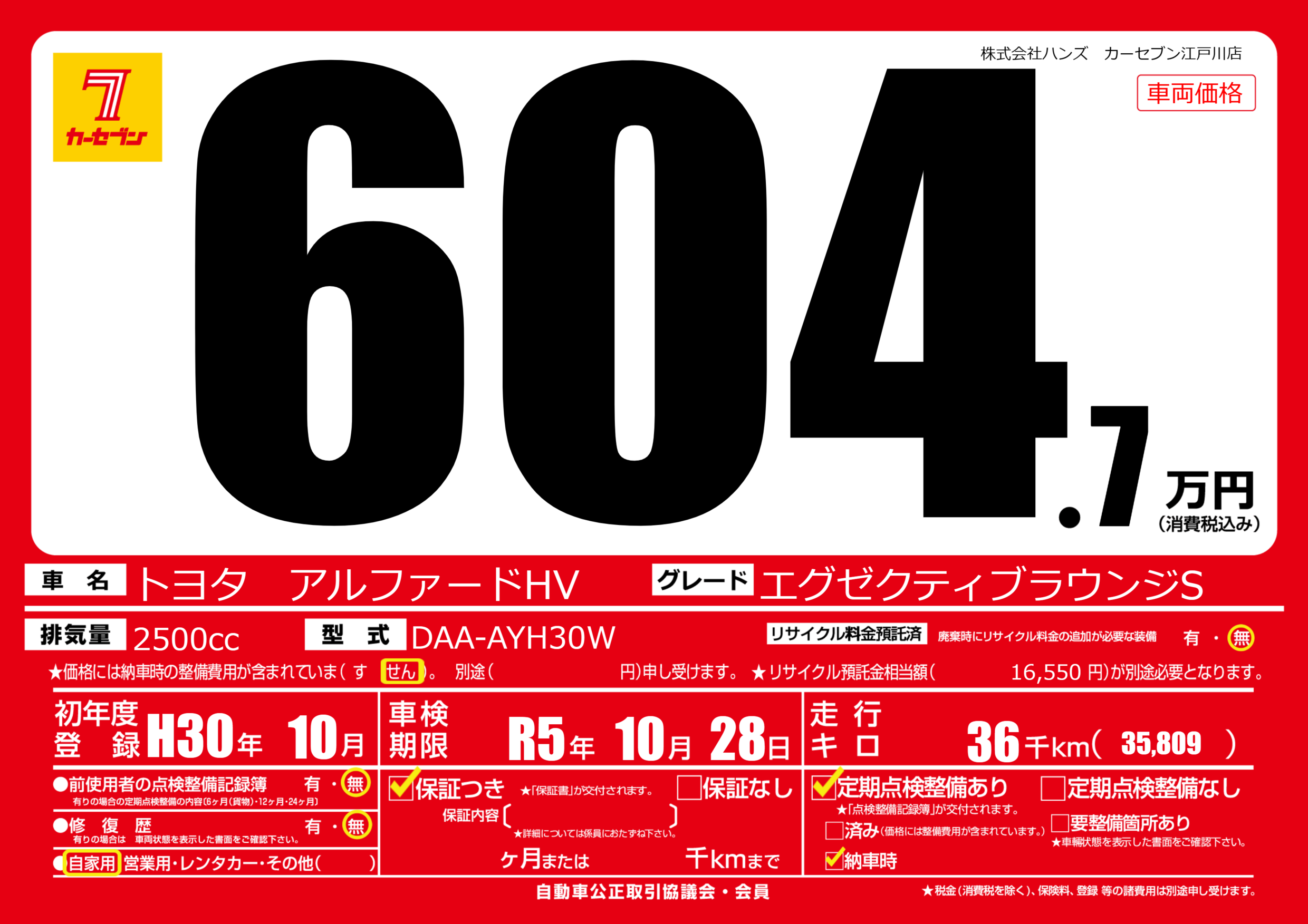 | 車名 | トヨタ アルファードHV | グレード ミッション 排気量 |