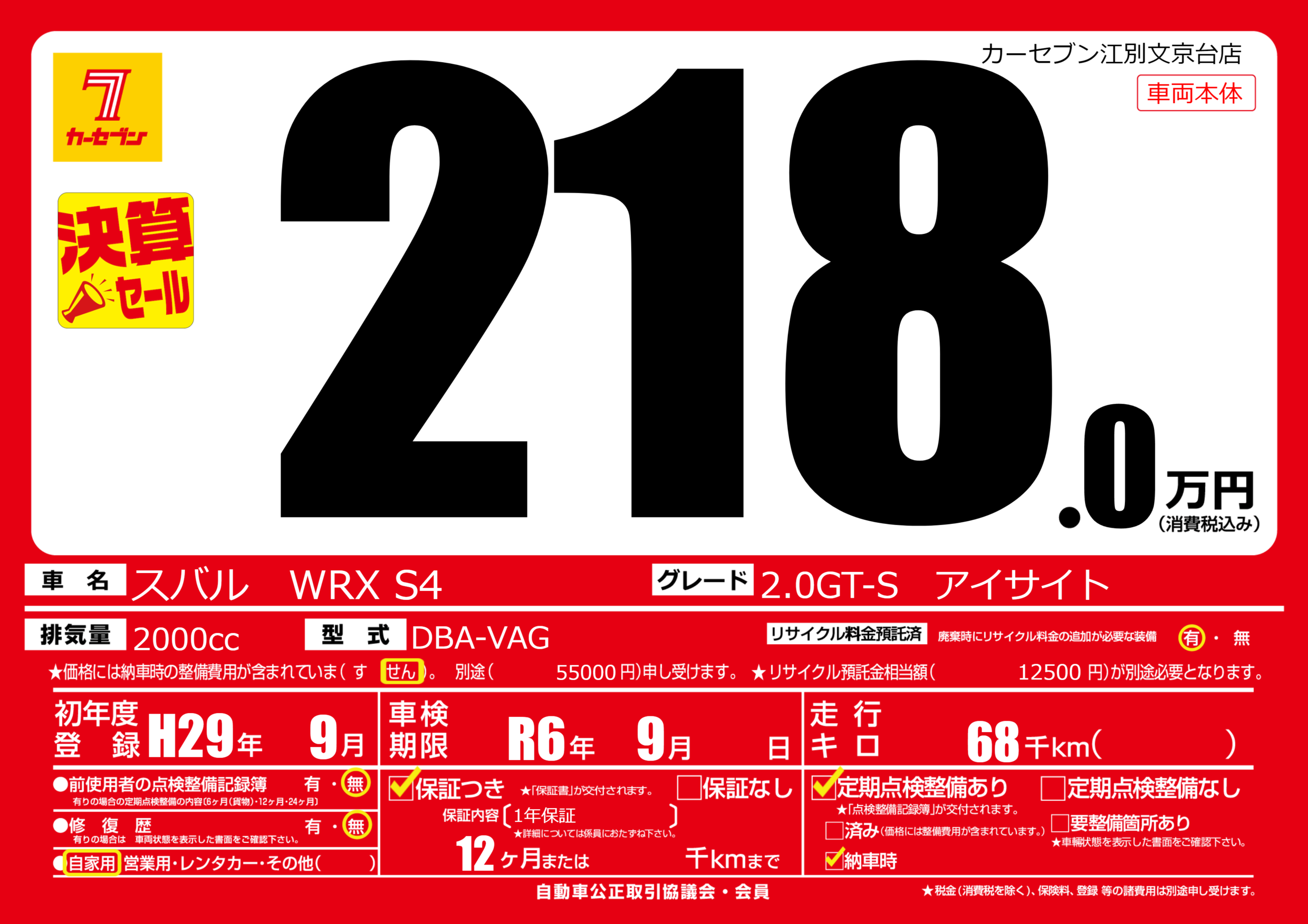 | 車名 | スバル WRX S4 | グレード ミッション 排気量 |