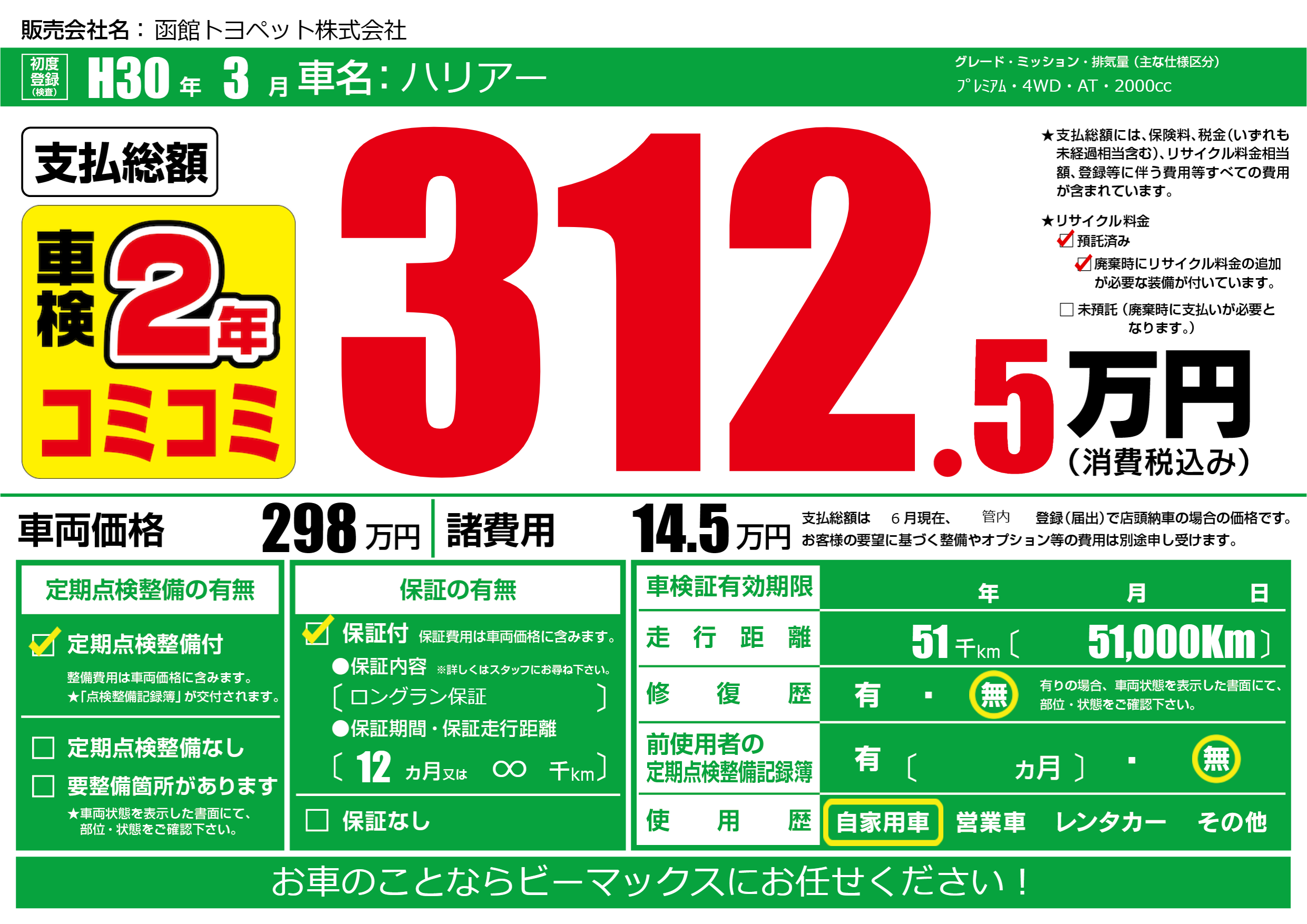 | 走行キロ | 5.1万km | 初年度登録 | H30年3月 |