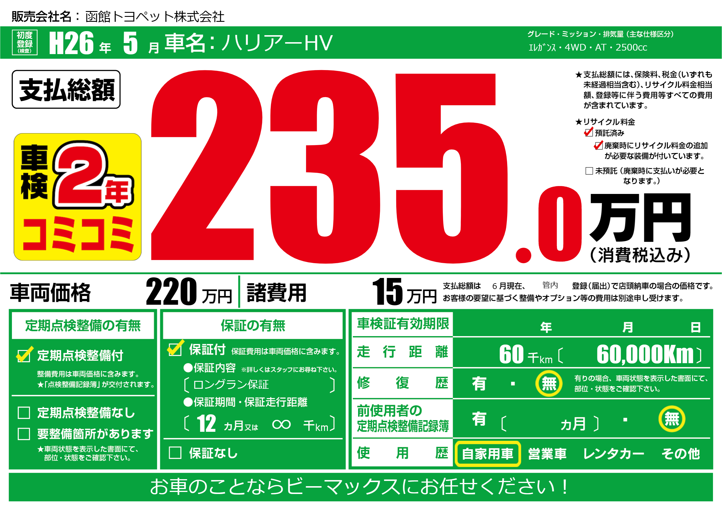 | 走行キロ | 6万km | 初年度登録 | H26年5月 |