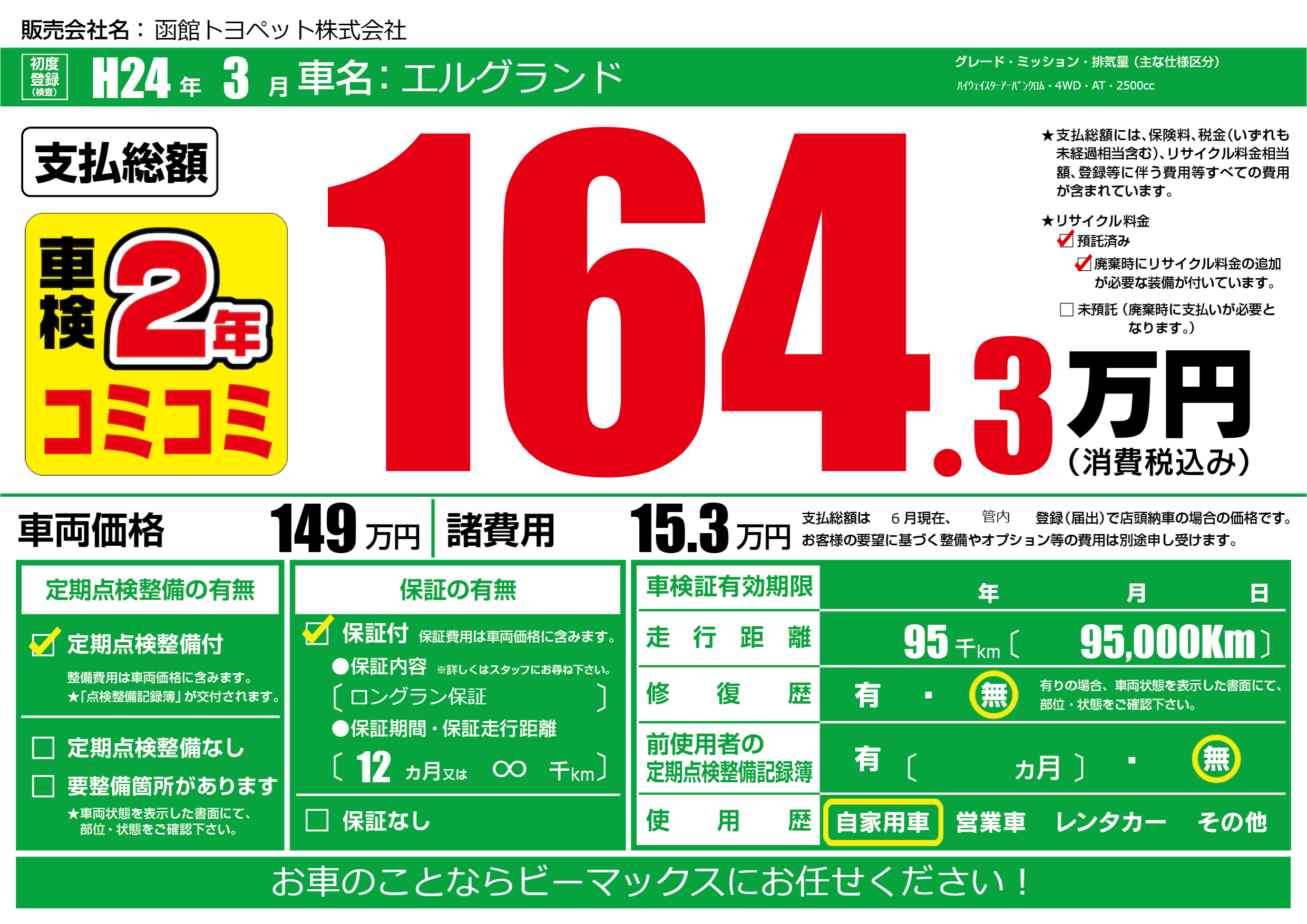 | 走行キロ | 9.5万km | 初年度登録 | H24年3月 |