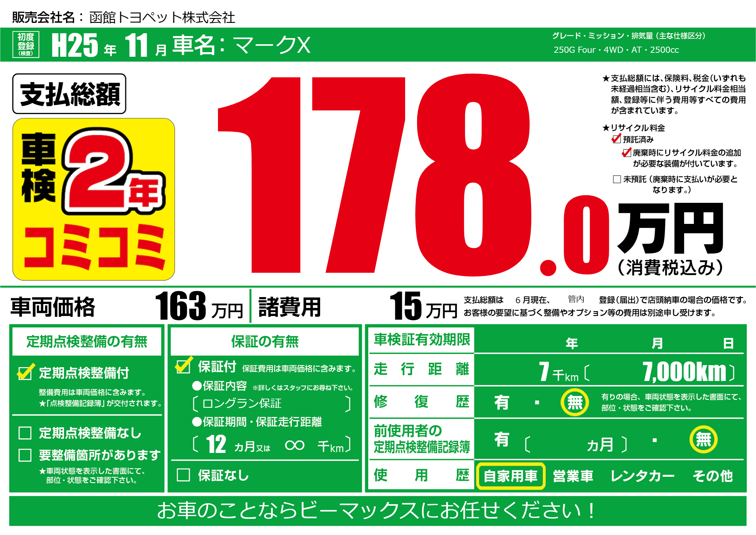 | 走行キロ | 0.7万km | 初年度登録 | H25年11月 |