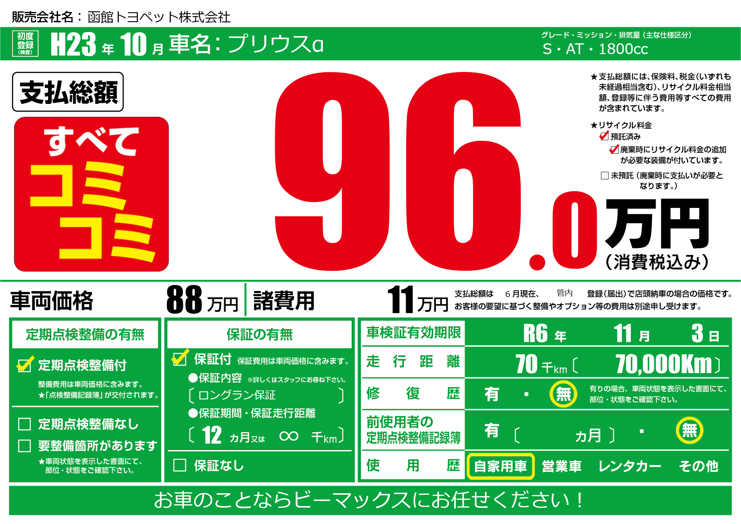| 走行キロ | 7万km | 初年度登録 | H23年10月 |