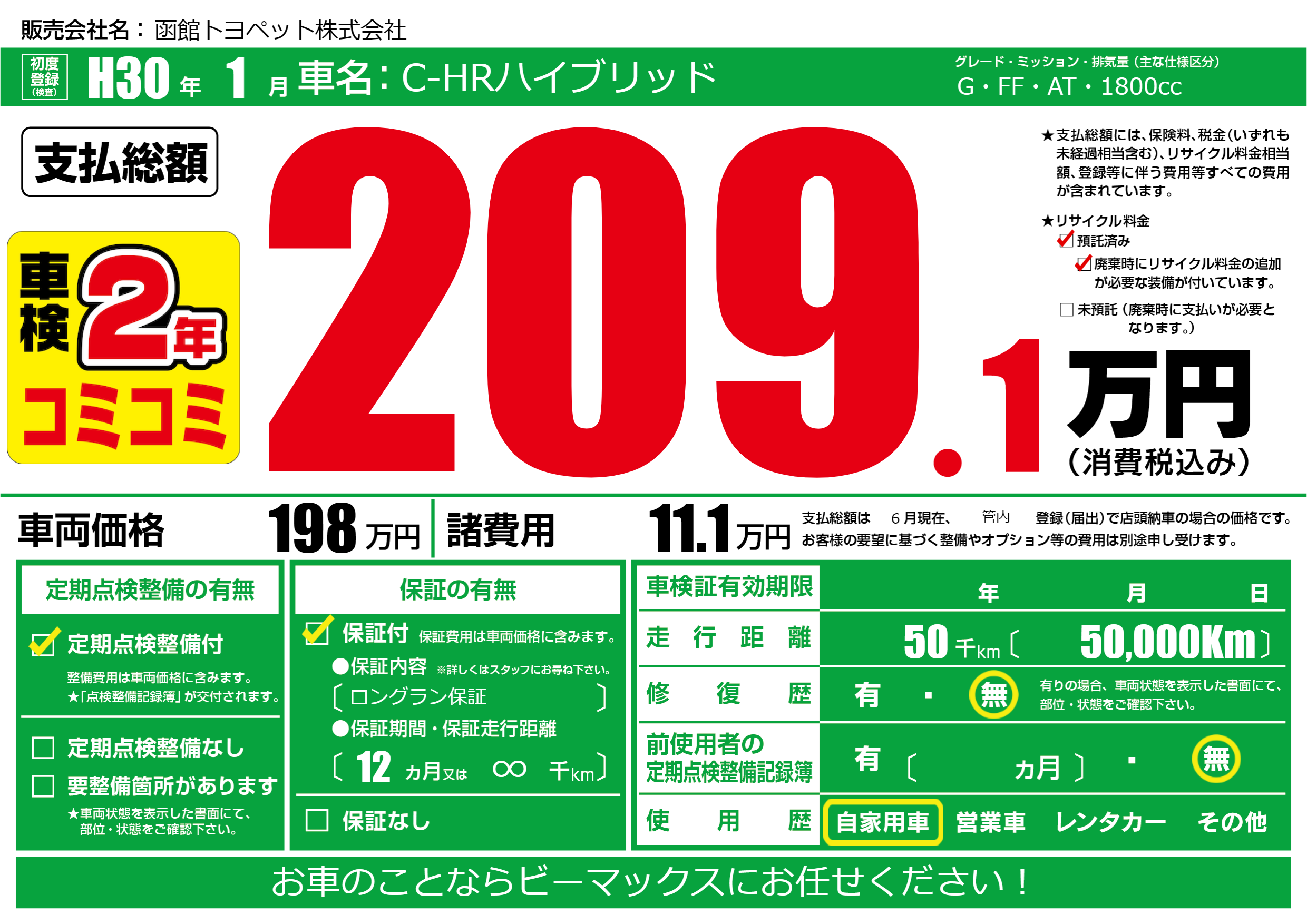 | 車名 | C-HRハイブリッド | グレード ミッション 排気量 |