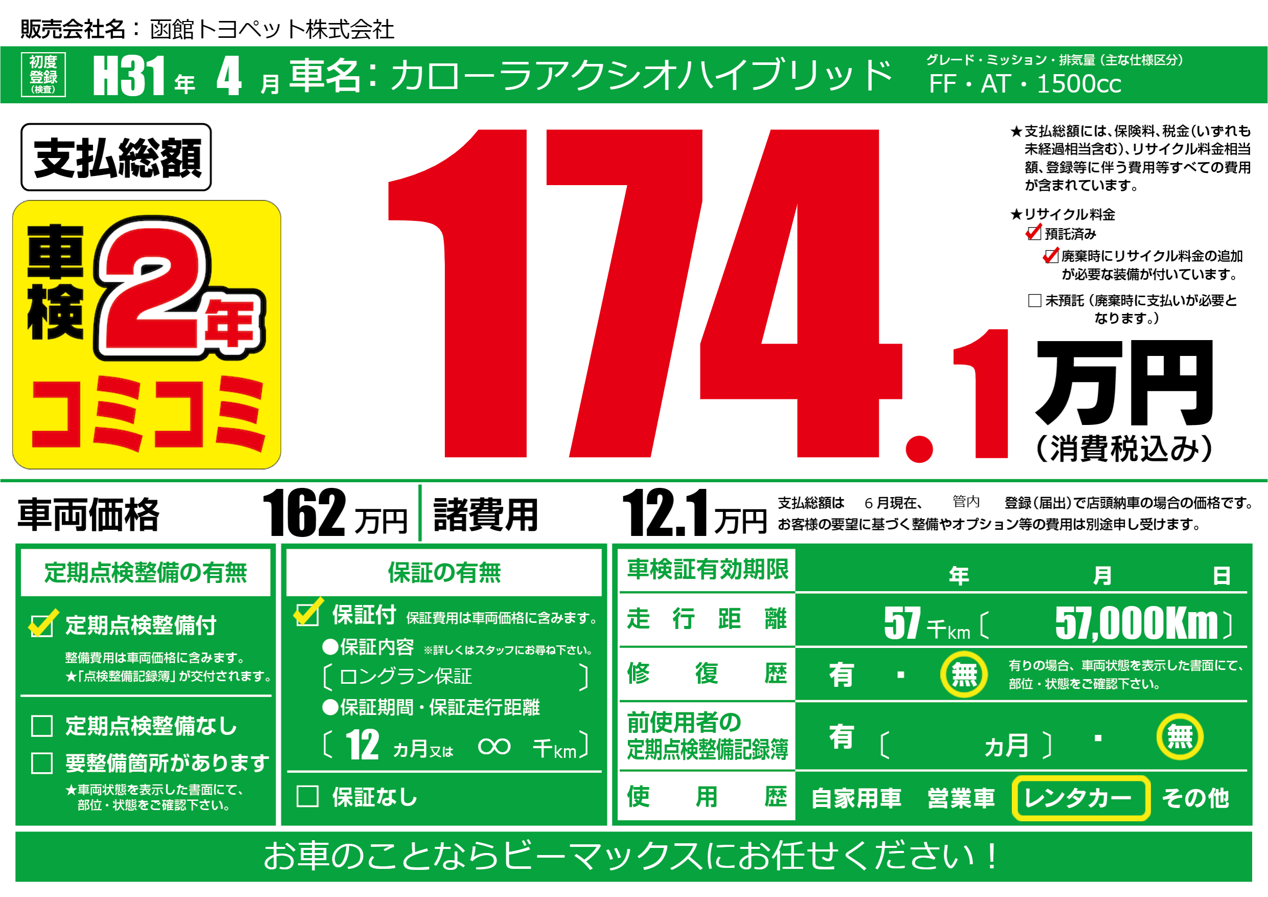 | 車名 | カローラアクシオハイブリッド | グレード ミッション 排気量 |