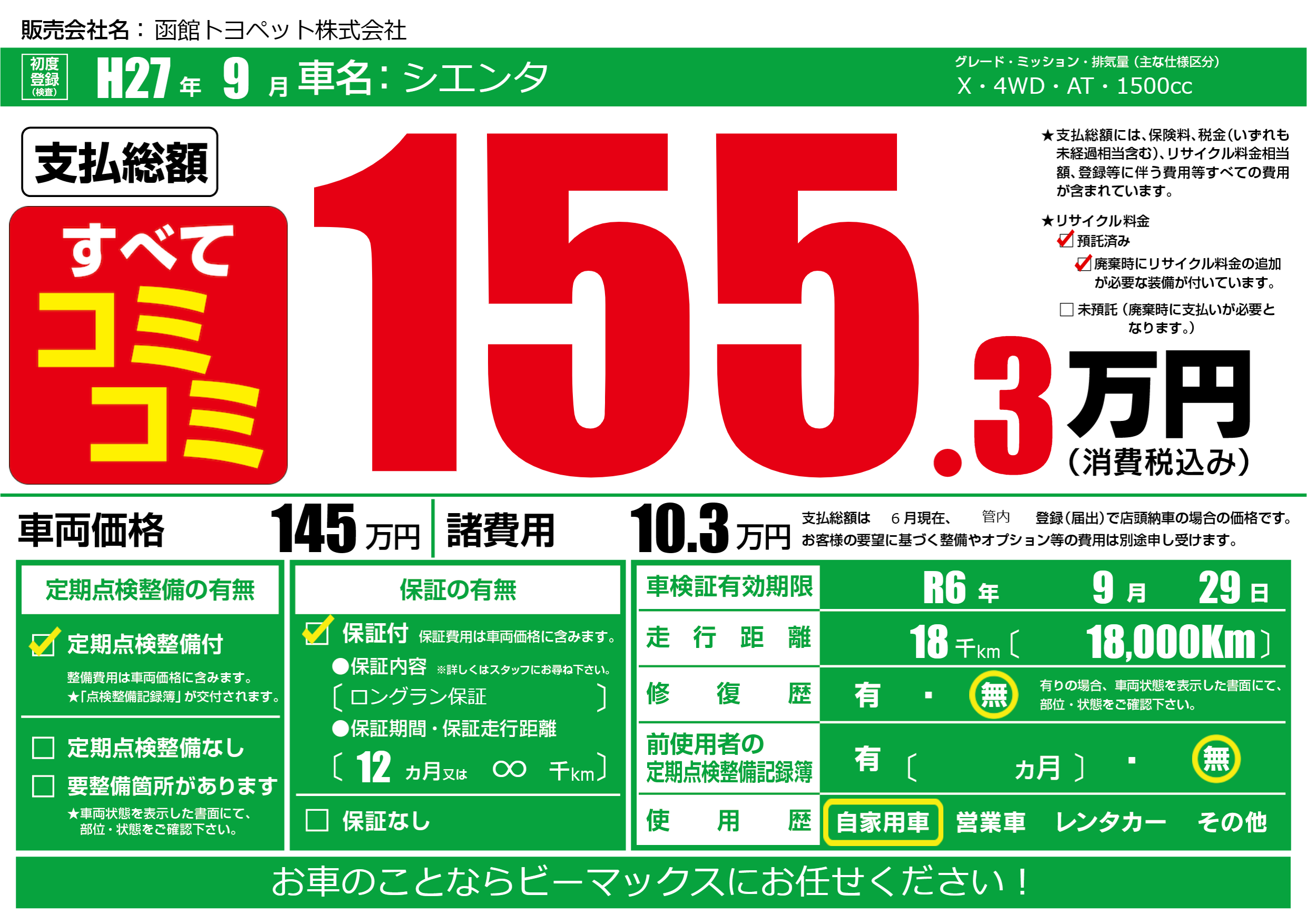 | 車名 | シエンタ | グレード ミッション 排気量 |