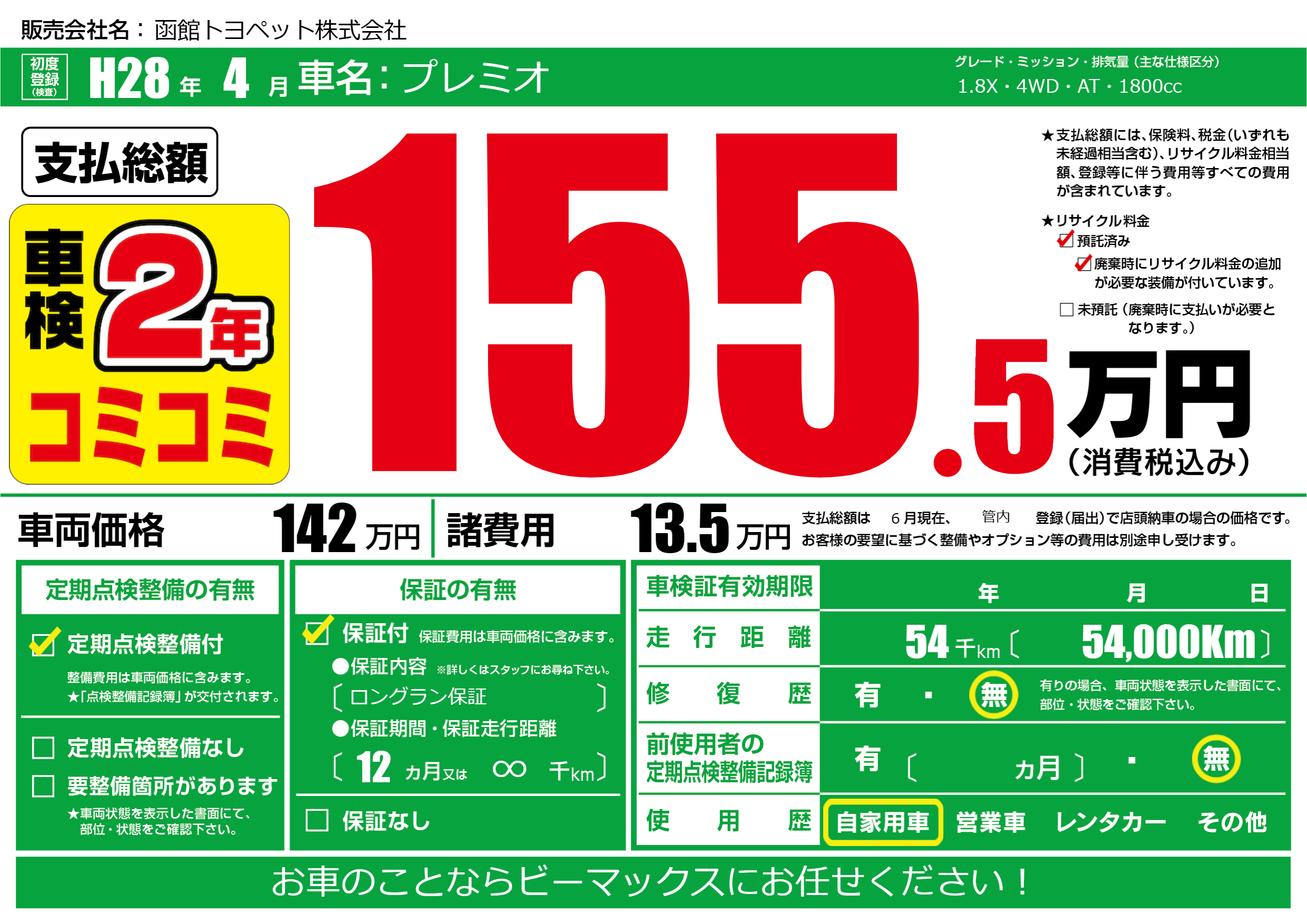 | 車名 | プレミオ | グレード ミッション 排気量 |