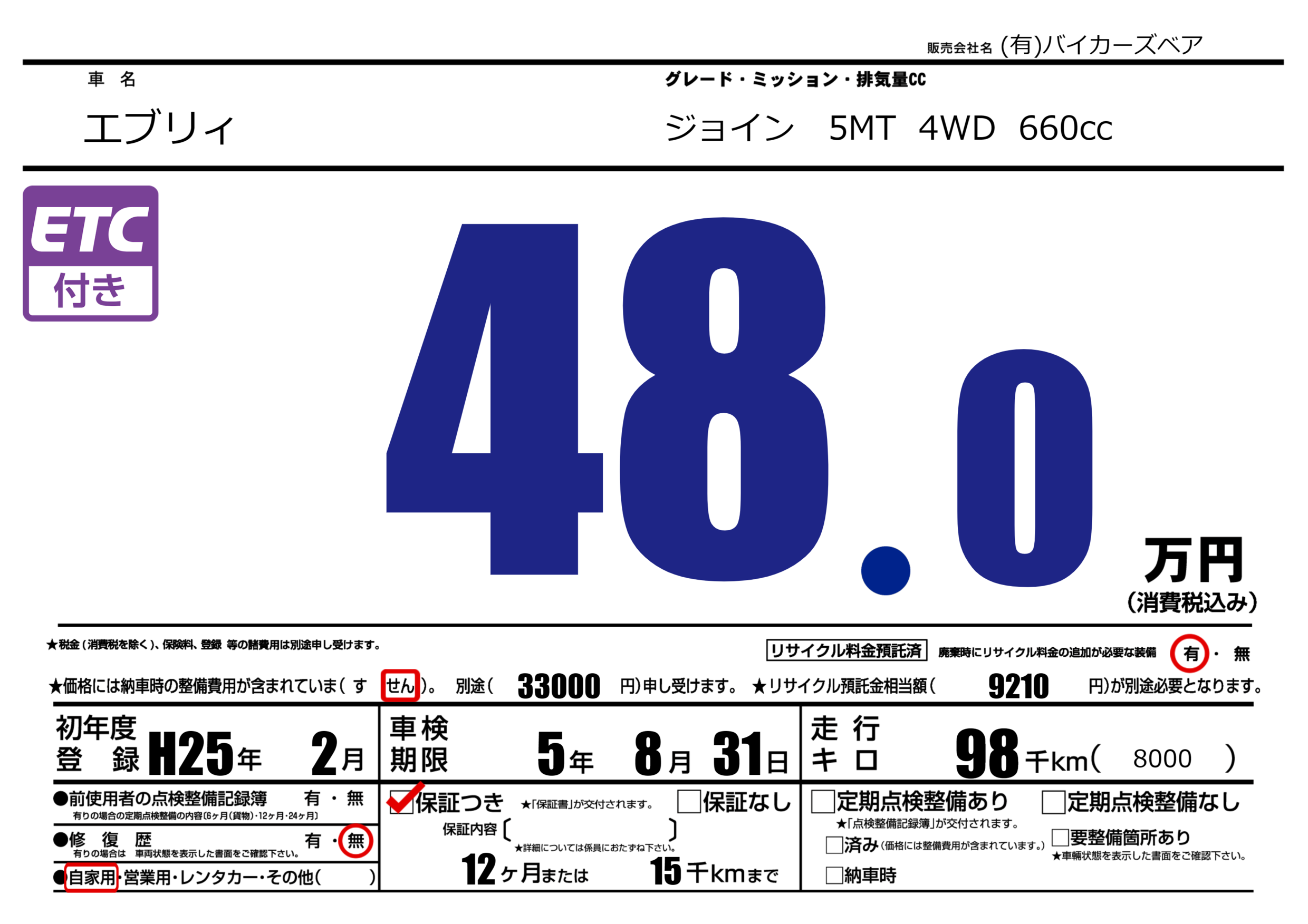 | 車名 | エブリィ | グレード ミッション 排気量 |