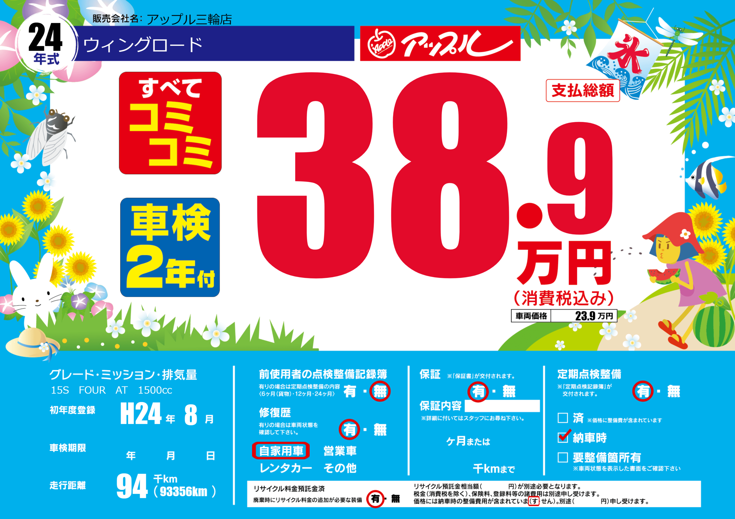 | 走行キロ | 9.4万km | 初年度登録 | H24年8月 |
