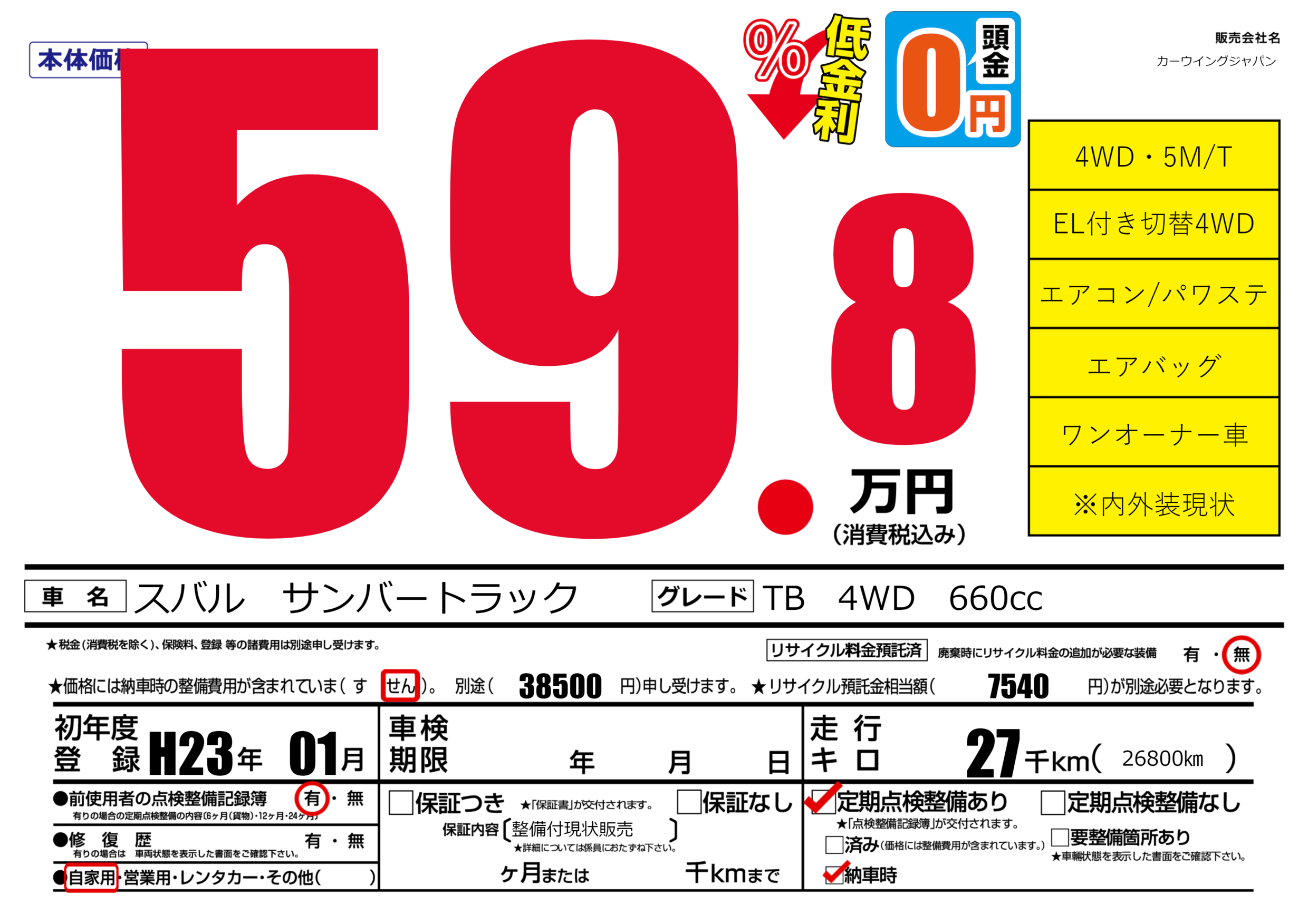 | 車名 | スバル サンバートラック | グレード ミッション 排気量 |