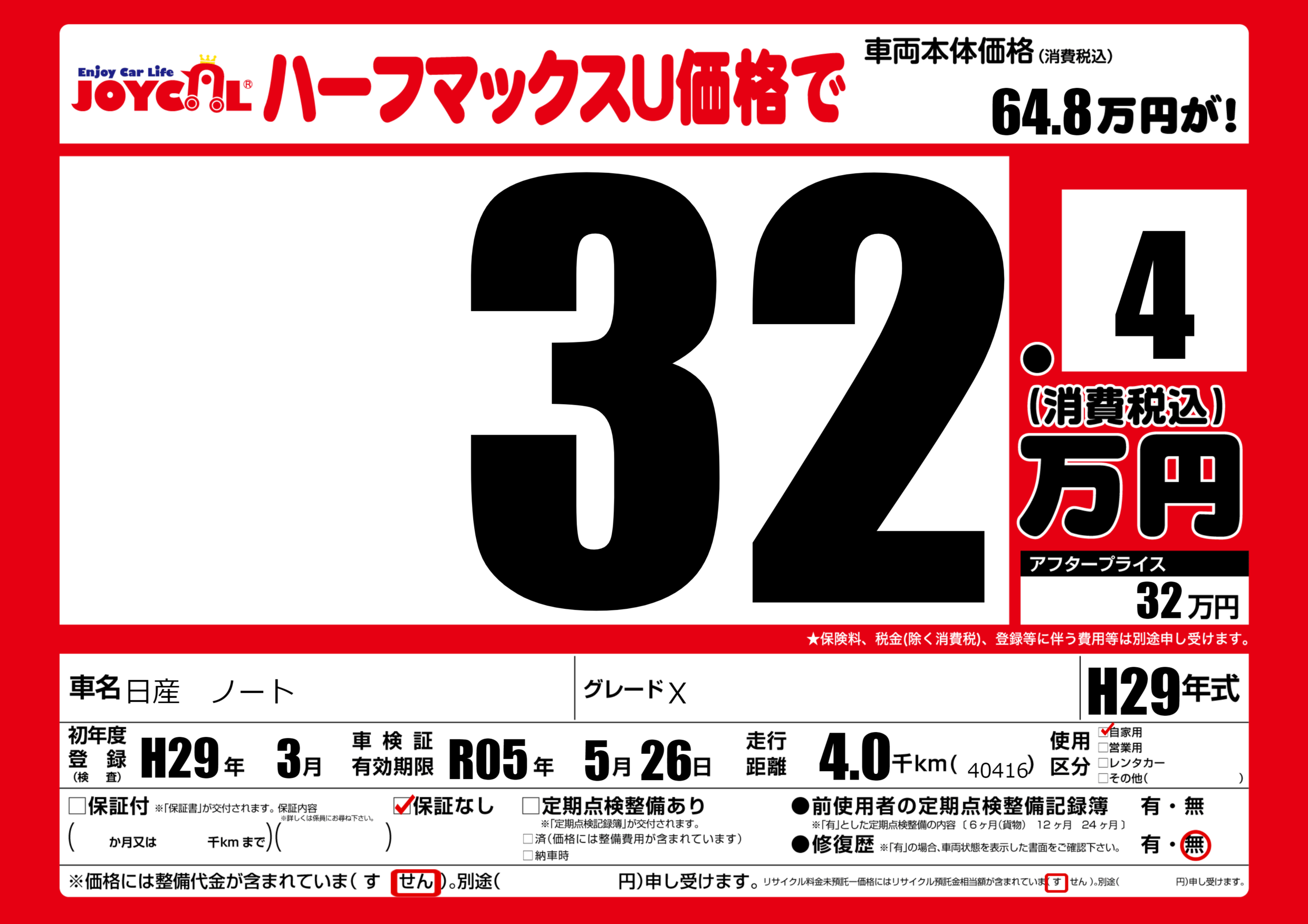 | 走行キロ | 0.4万km | 初年度登録 | H29年3月 |