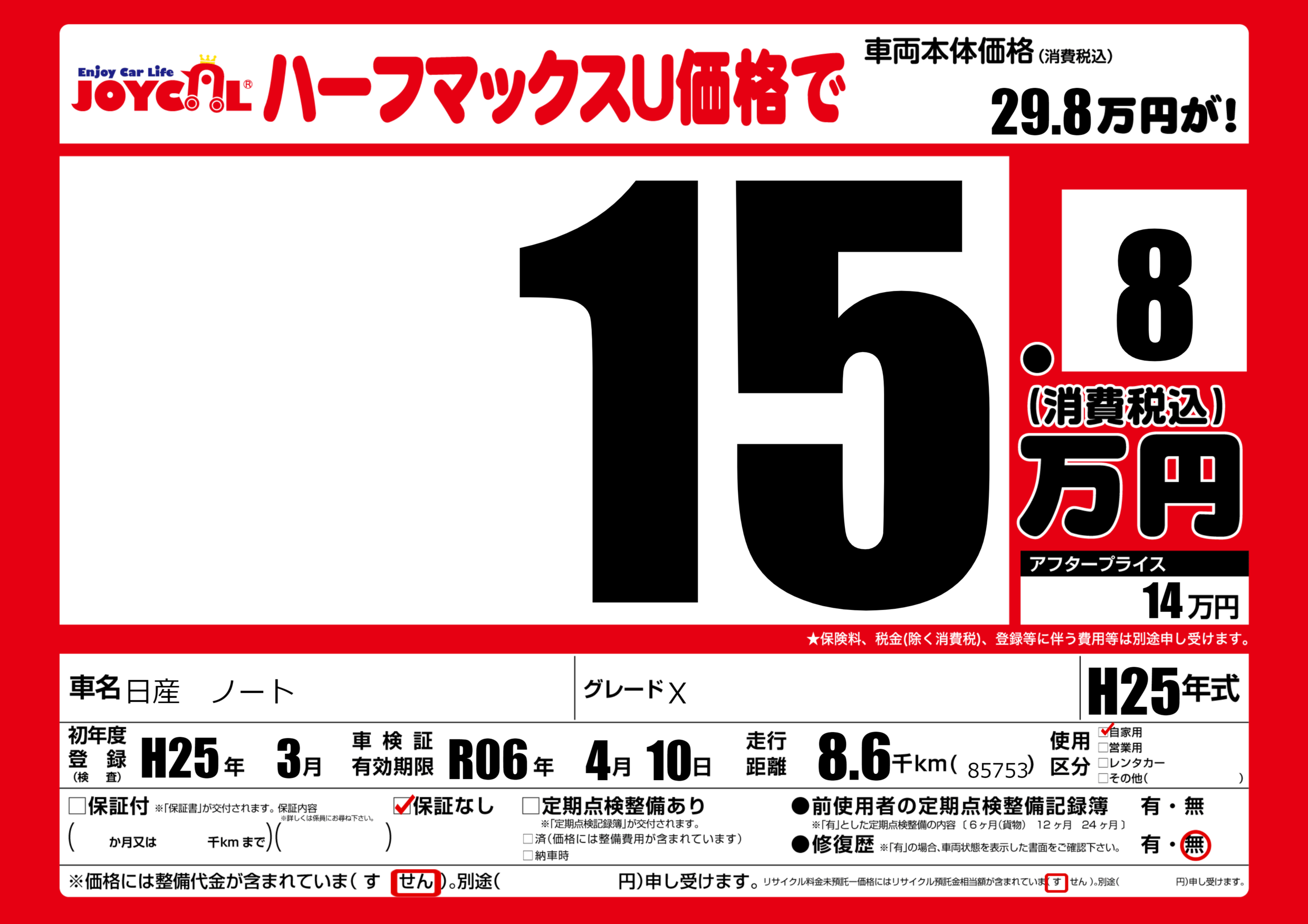 | 走行キロ | 0.8万km | 初年度登録 | H25年3月 |
