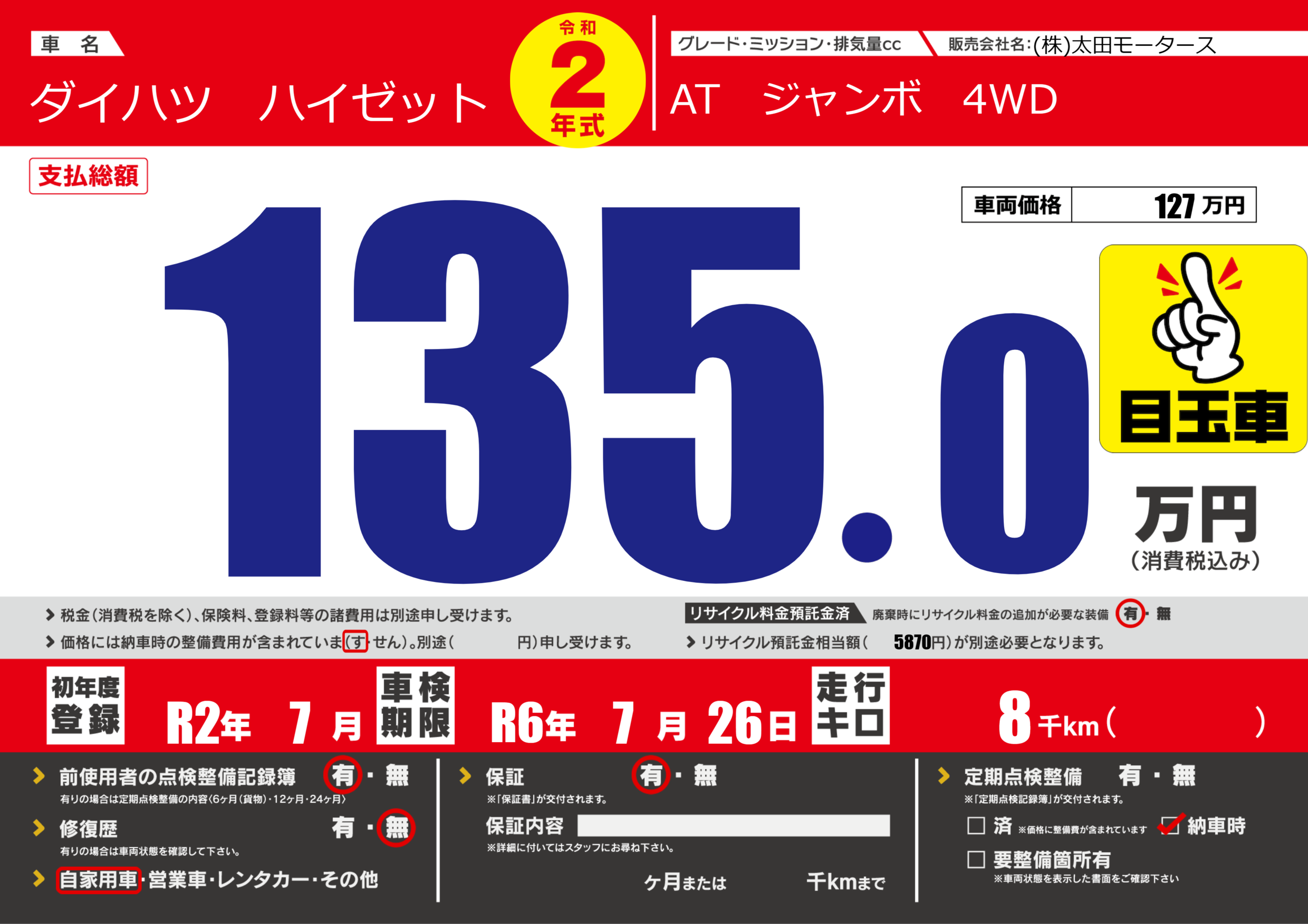 | 走行キロ | 0.8万km | 初年度登録 | R2年7月 |