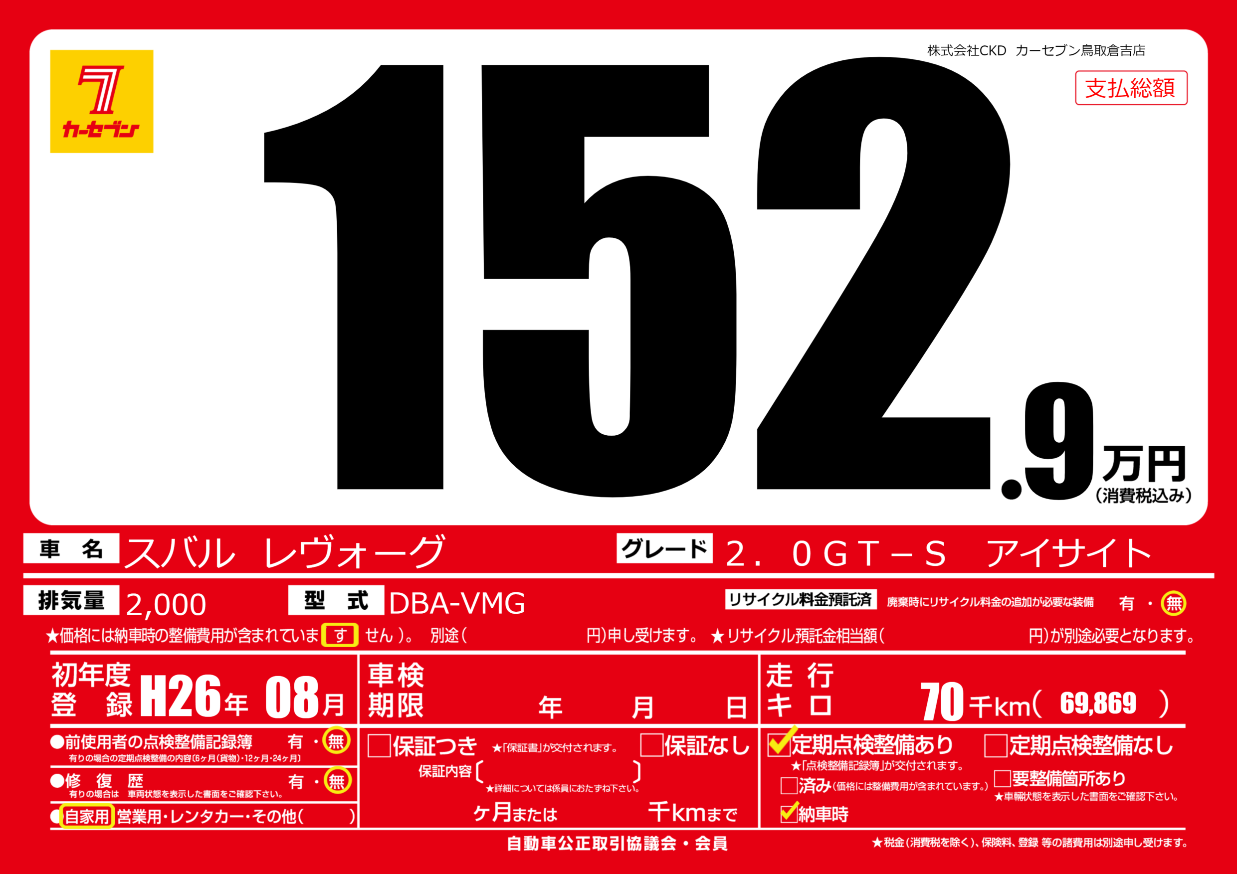 | 車名 | スバル レヴォーグ | グレード ミッション 排気量 |