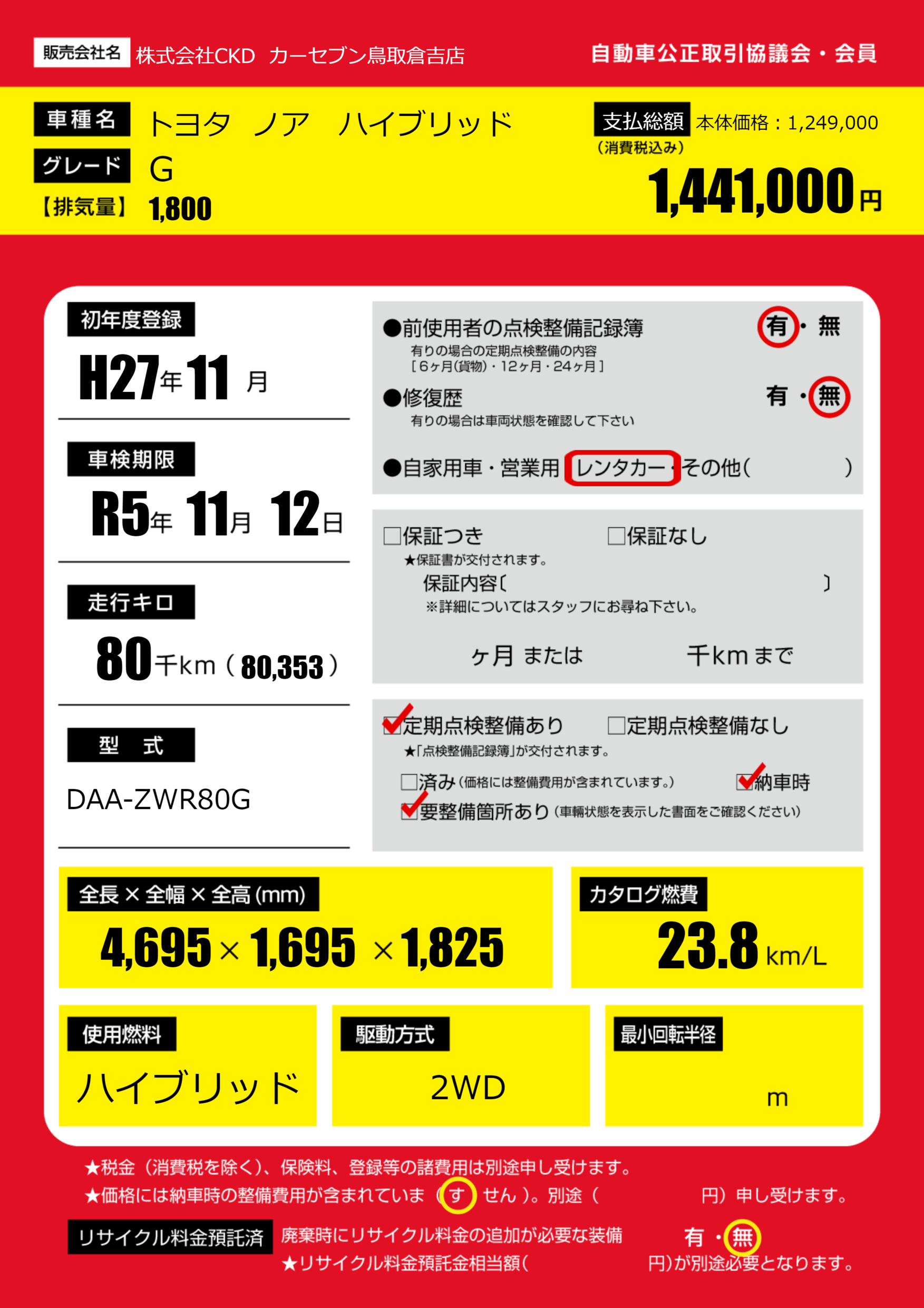 | 車名 | トヨタ ノア ハイブリッド | グレード ミッション 排気量 |